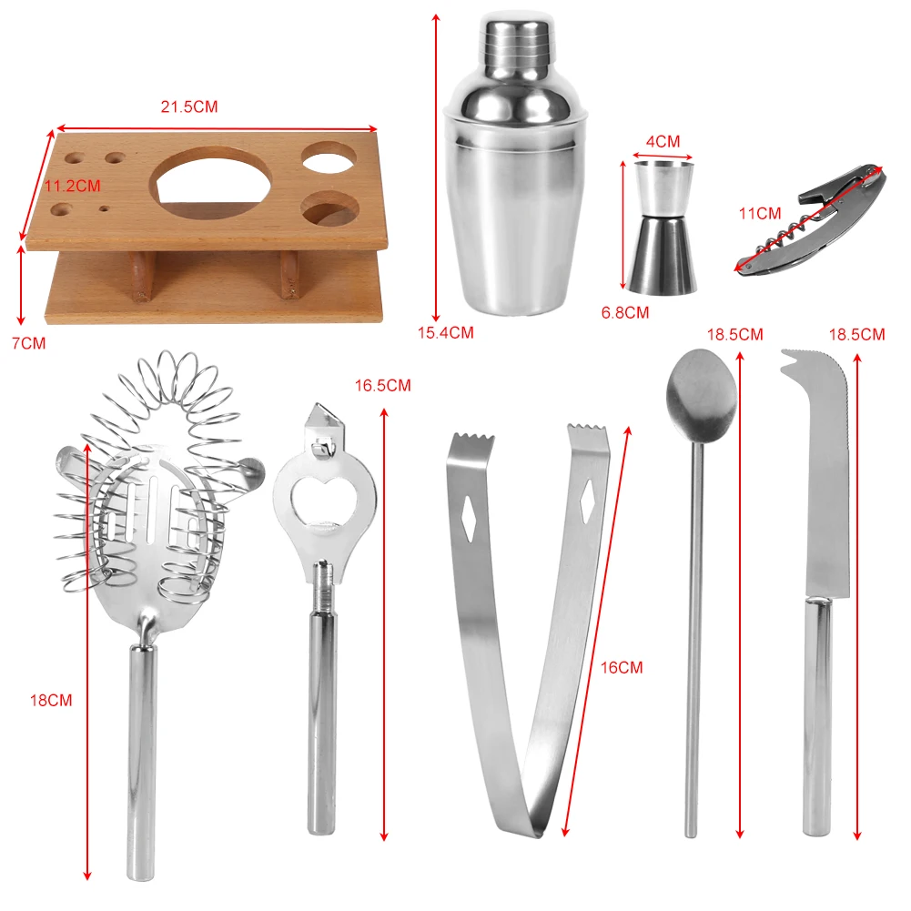 Посылка включает в себя: 1x350 мл шейкер для коктейлей 1 x чашка с двойной головкой 1 х нож для сыра 1 x Ice Tong 1 x фильтр для льда 1 х открывалка для пивных бутылок 1 х открывалка для вина 1 х Ложка для смешивания 1 х деревянный держатель