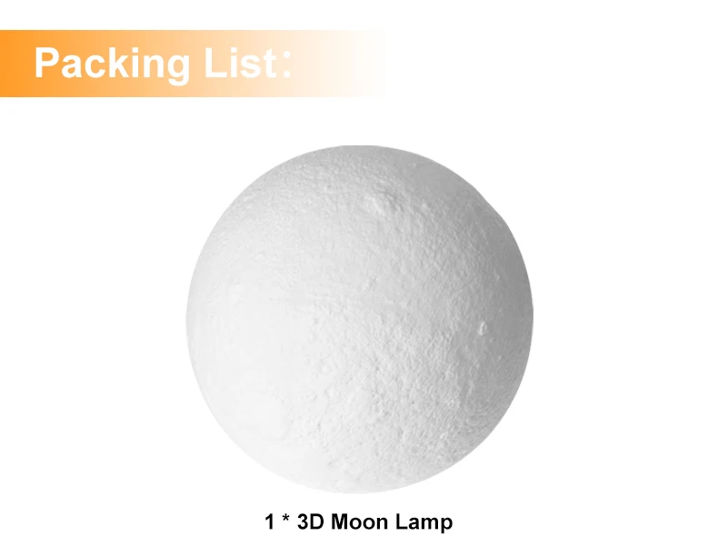 1 * 3D лампа Луны1 * деревянная подставка1 * USB кабель питания (длина: 90 см)1 * Инструкция1 * пульт дистанционного управления (только 16 цветов в комплекте)