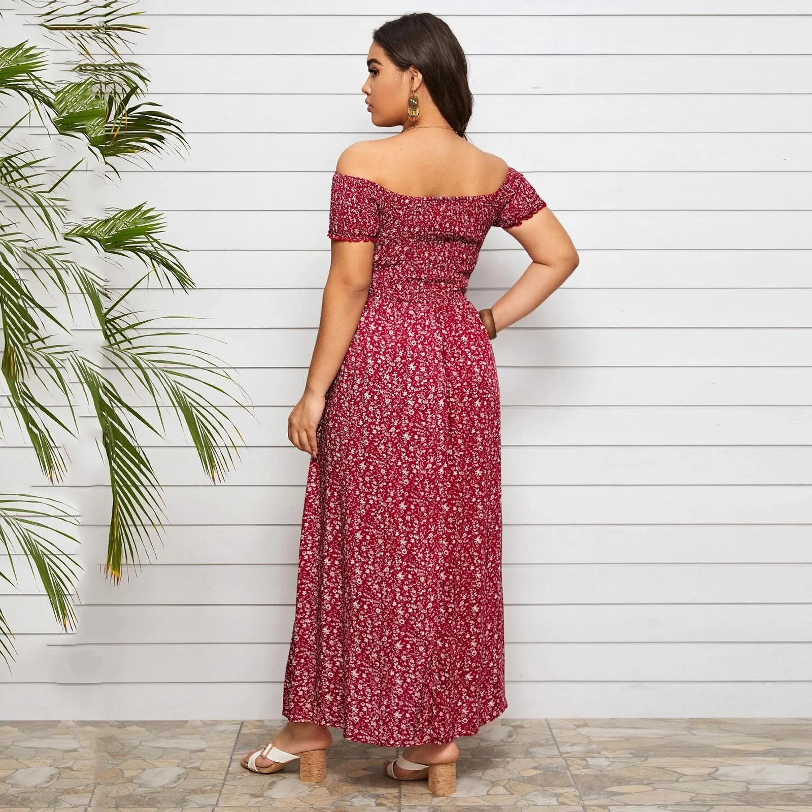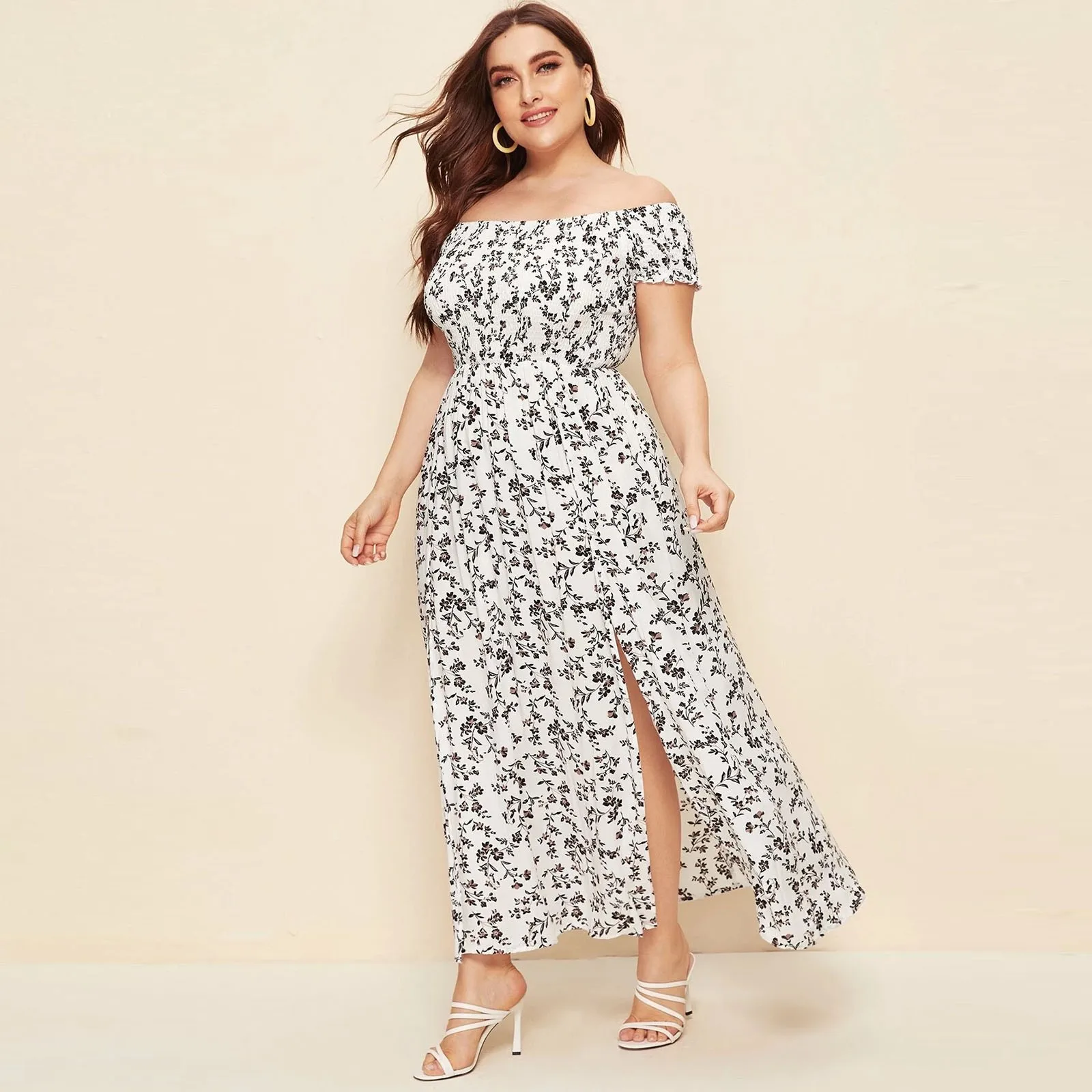 Женское платье с открытыми плечами размера плюс, винтажное длинное пляжное платье с цветочным принтом и разрезом, белое платье в богемном стиле на лето