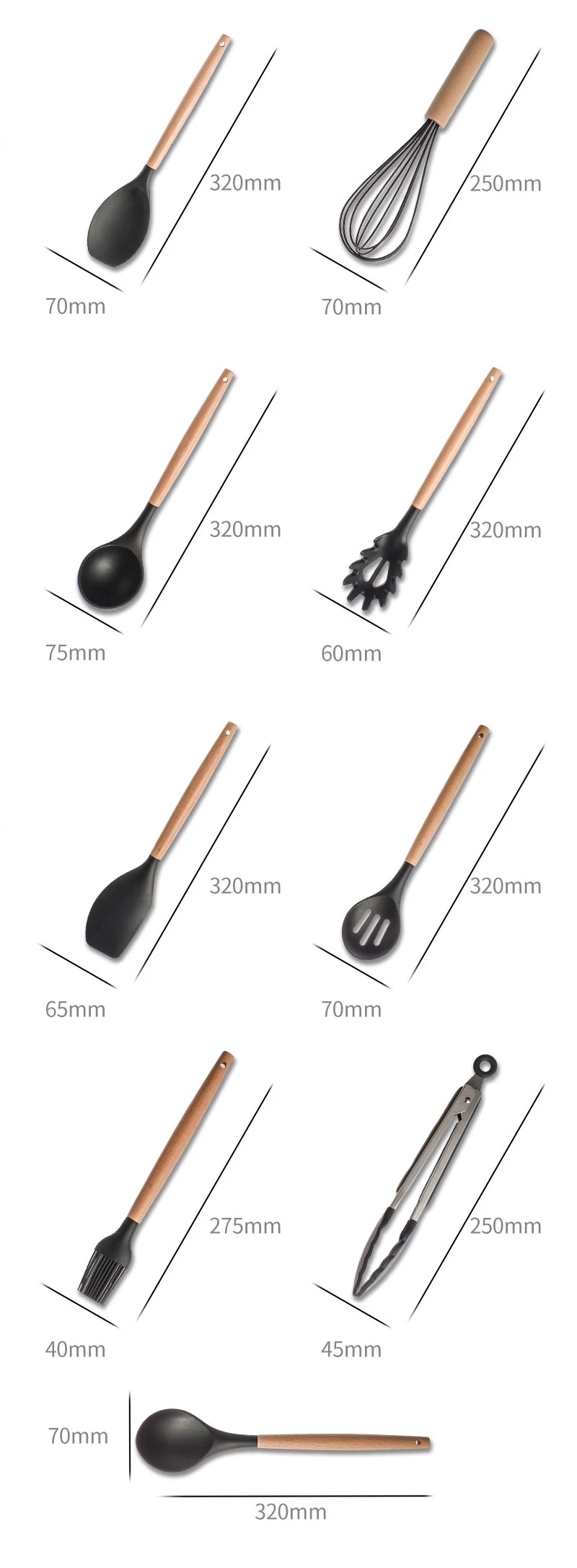 Набор силиконовой посуды-кухонный помощник, идеально подходит для всех видов продуктов и кухонных принадлежностей, жарки, перемешивания крема, масла, мороженого и т. д. Включает лопатку, щётку для протирания, шпатель с острым носком, Тернер с круглыми краями, ковш, токарь с прямыми краями, ложку, щипцы, Паста вилка и идеально подходит для всех типов продуктов и приготовления пищи.