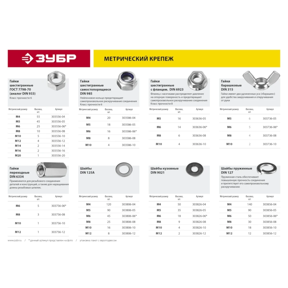 Гайка переходная DIN 6334 M6 5 шт. ЗУБР 303756-06 - Гайки переходные изготовлены из высококачественной стали в полном соответствии с действующими стандартами и техническими предписаниями. Находят широкое применение в машиностроении, приборостроении, строительстве, быту и т.д..Преимущества:Благодаря удлиненной форме гайки переходные используются для наращивания длины шпилек, болтов или винтов;Широко применяются в машиностроении, приборостроении, строительстве, быту и т.д.;Цинковое покрытие защищает от коррозии и продлевает срок службы изделия.-Метрическая резьба (d): М6 -Размер под ключ (S): 10 мм-Длина гайки (m): 18 мм-Шаг резьбы: 1.0 мм-Диаметр описанной окружности (е): 11.05 мм-Упаковка: 5 шт.Комплект поставки:Гарантия:0 месяцев