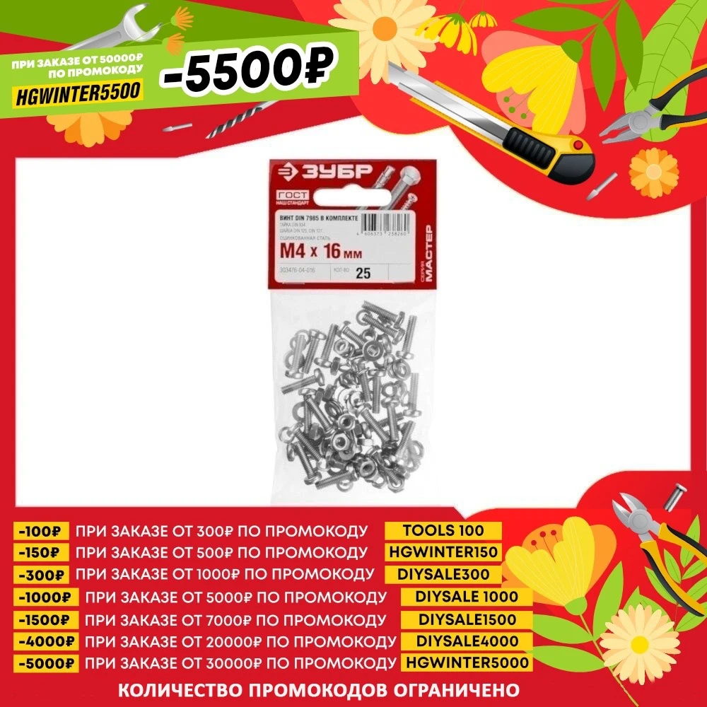 Винт DIN 7985 M4 x 16 мм в комплекте с гайкой и шайбами 25 шт. ЗУБР 303476-04-016