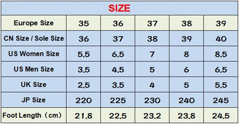 1. Пожалуйста, выберите размер в соответствии с длиной Вашей стопы или Европейским размером, согласно таблице размеров ниже. Если у вас широкая или Толстая стопа, выбирайте обувь большего размера.