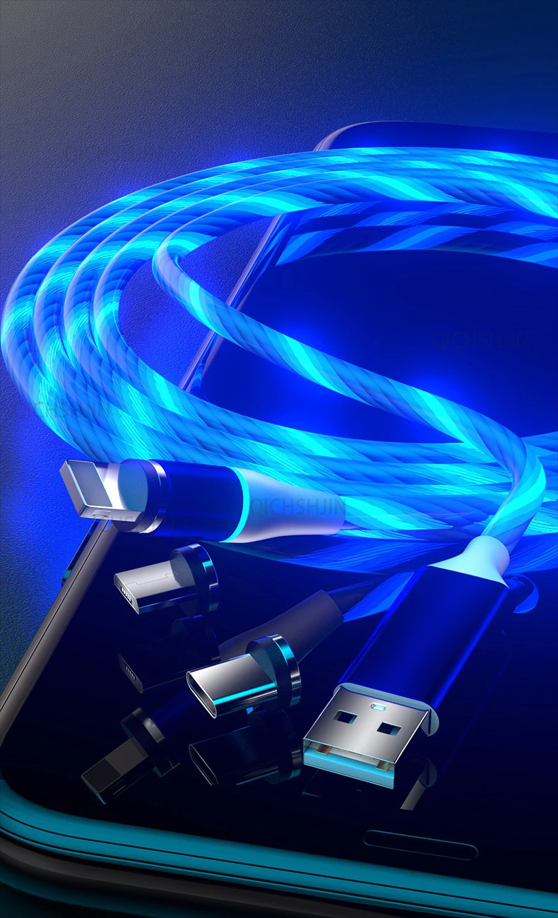 Магнитный кабель 3A для iPhone, Xiaomi, Samsung, Micro USB, Type C, светящийся светодиодный провод, быстрая зарядка, магнитное зарядное устройство, светящийся шнур