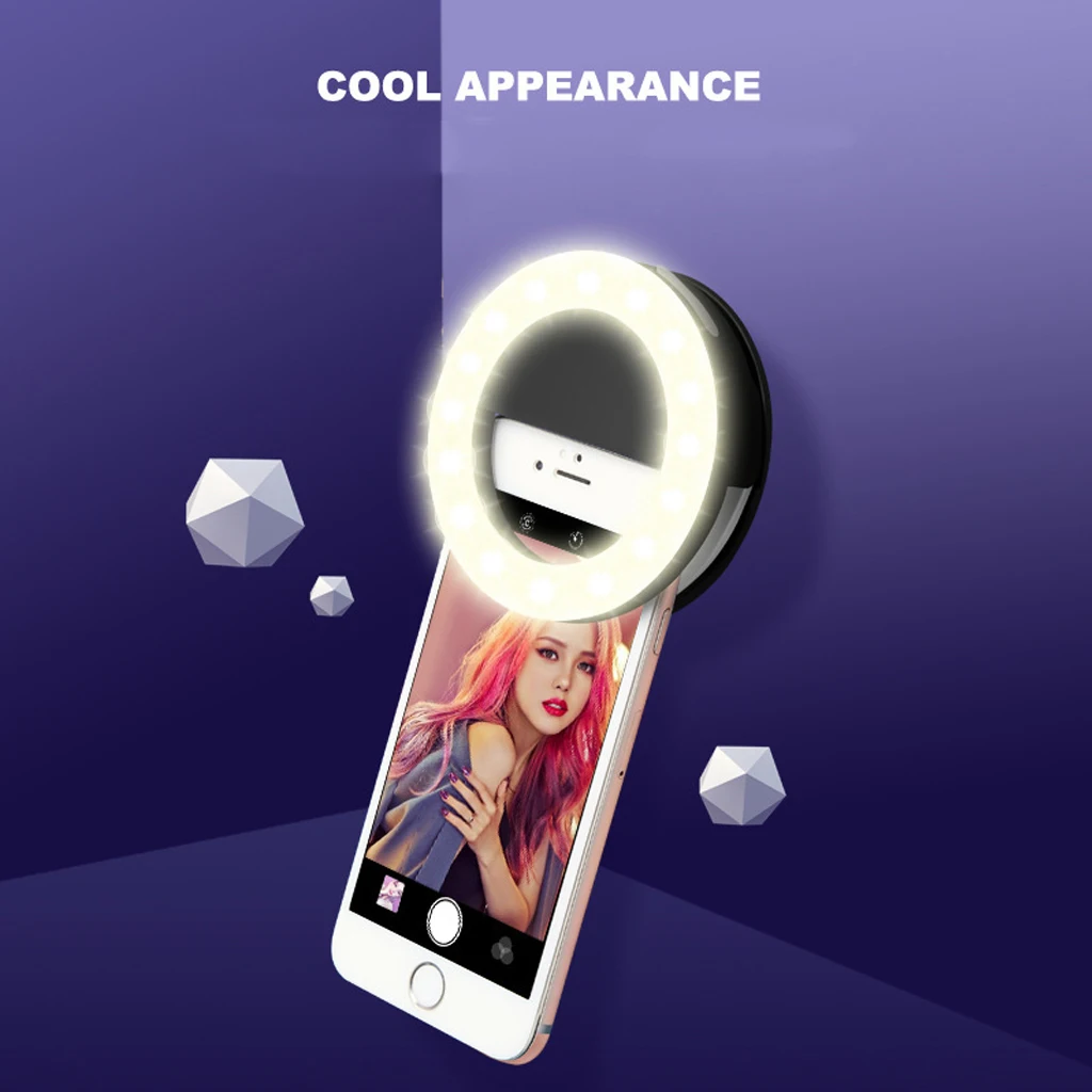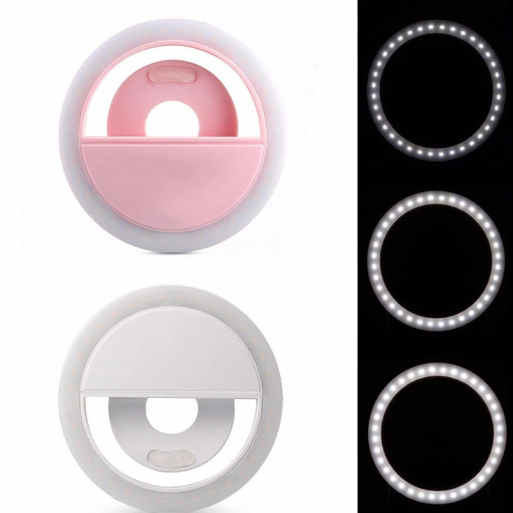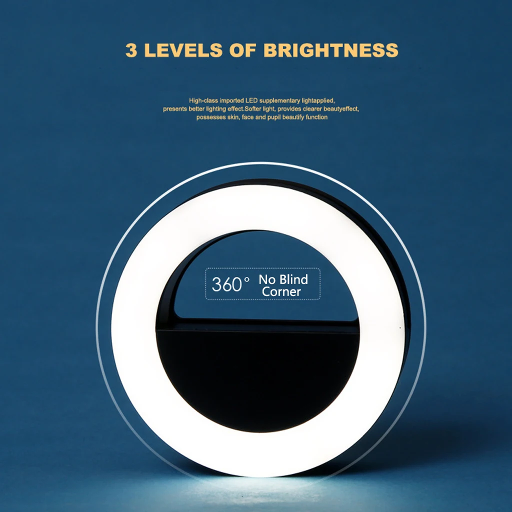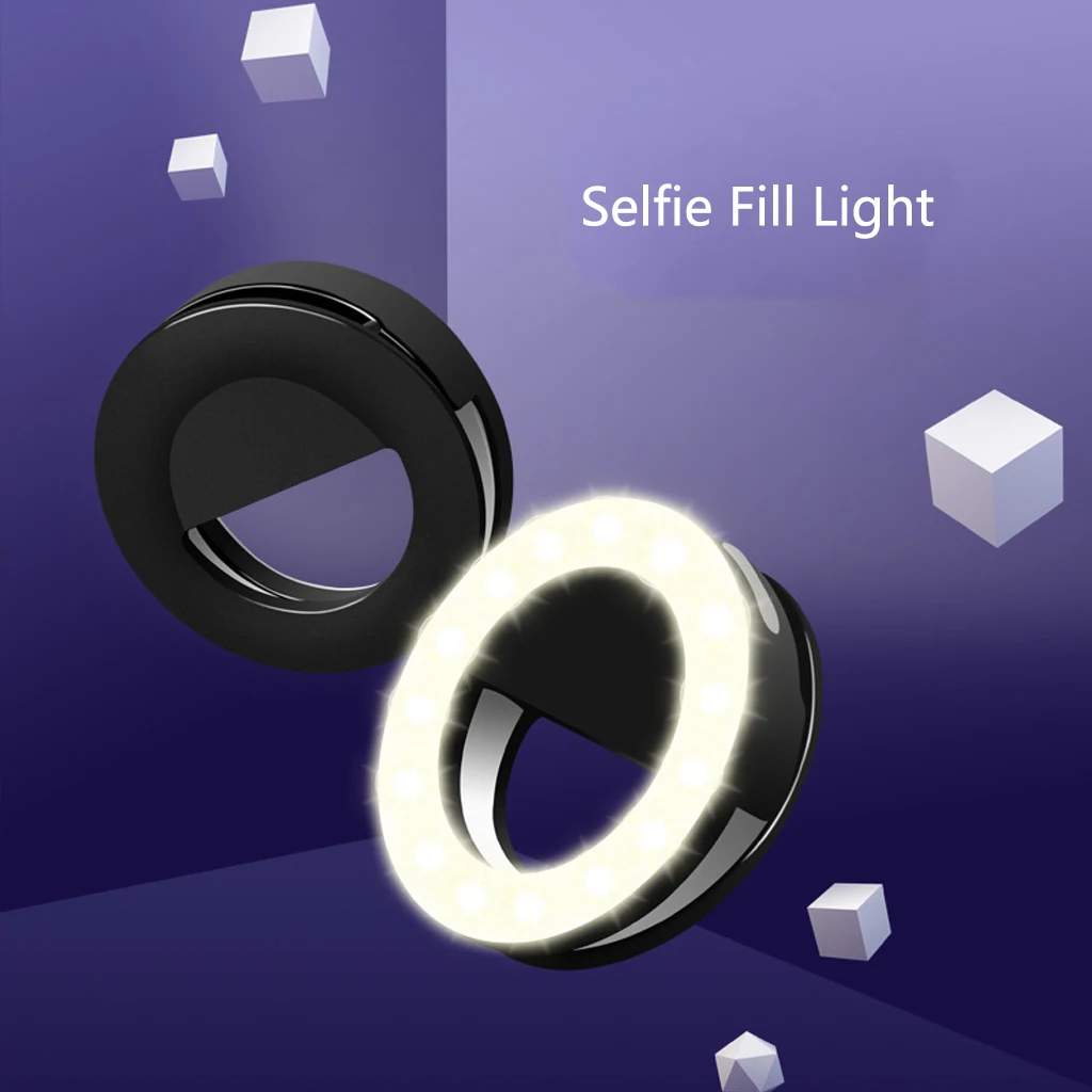 Кольцевой светодиодный светильник для селфи, лампа с кольцевым заполнением для телефона или камеры, с зарядкой через USB, с 3 уровнями яркости, с зажимом для IPhone, Xiaomi, Huawei