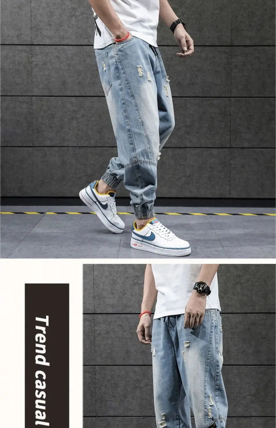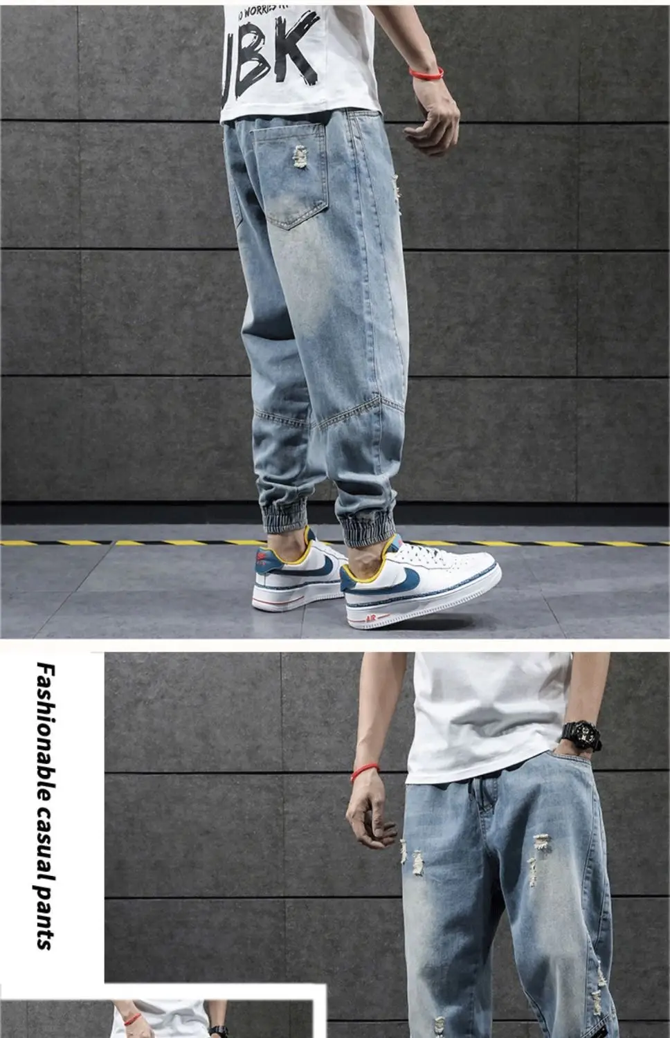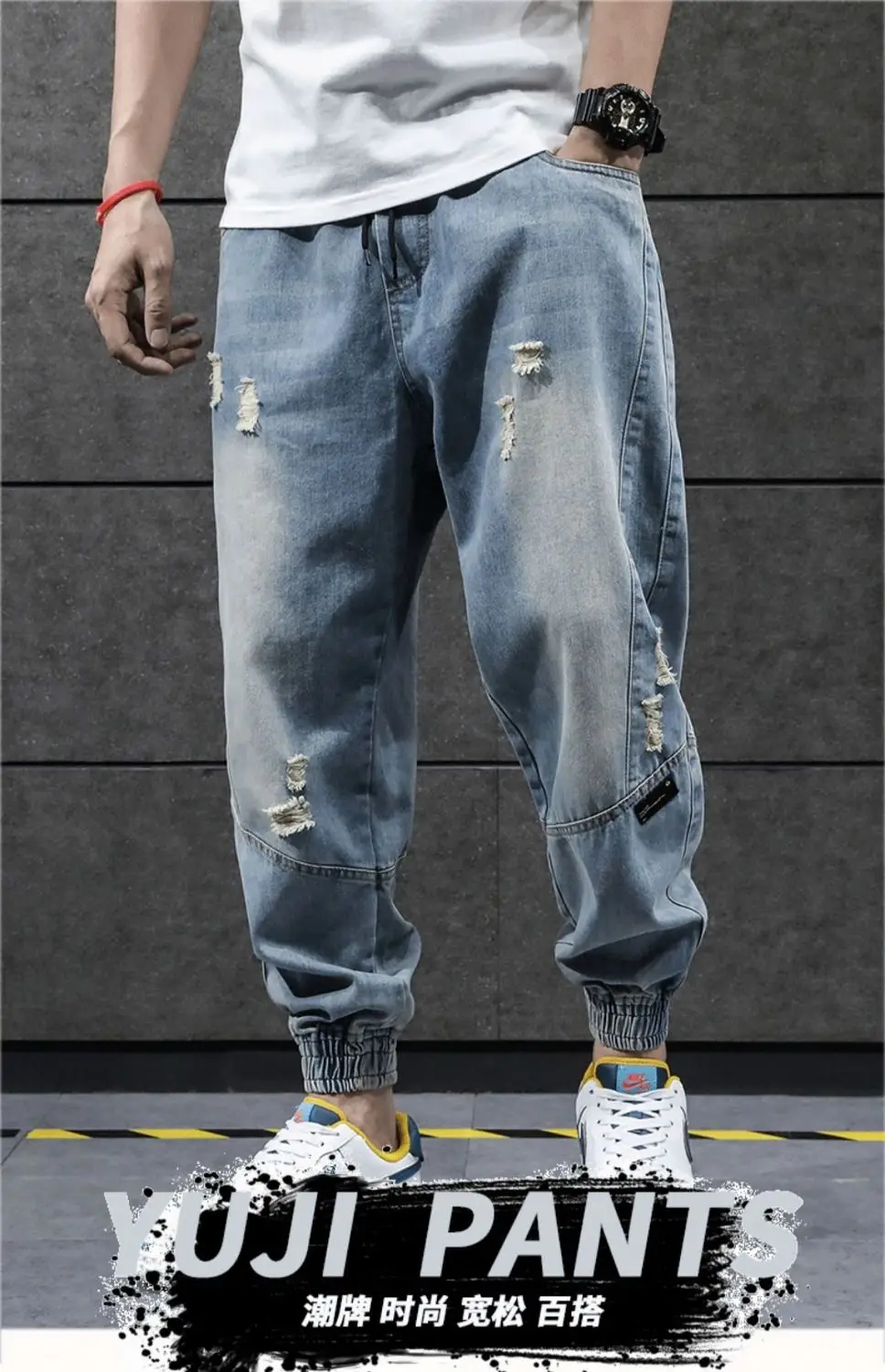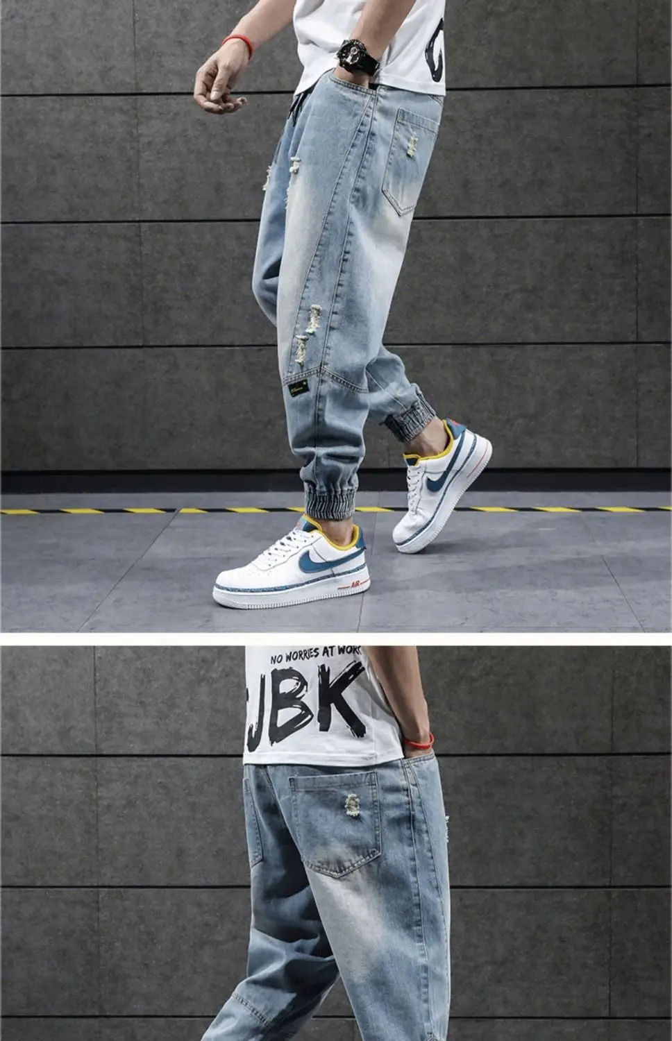 Джинсы-карго мужские свободного покроя L, брюки-султанки в Корейском стиле, винтажные рваные джинсы до щиколотки, синие, осень