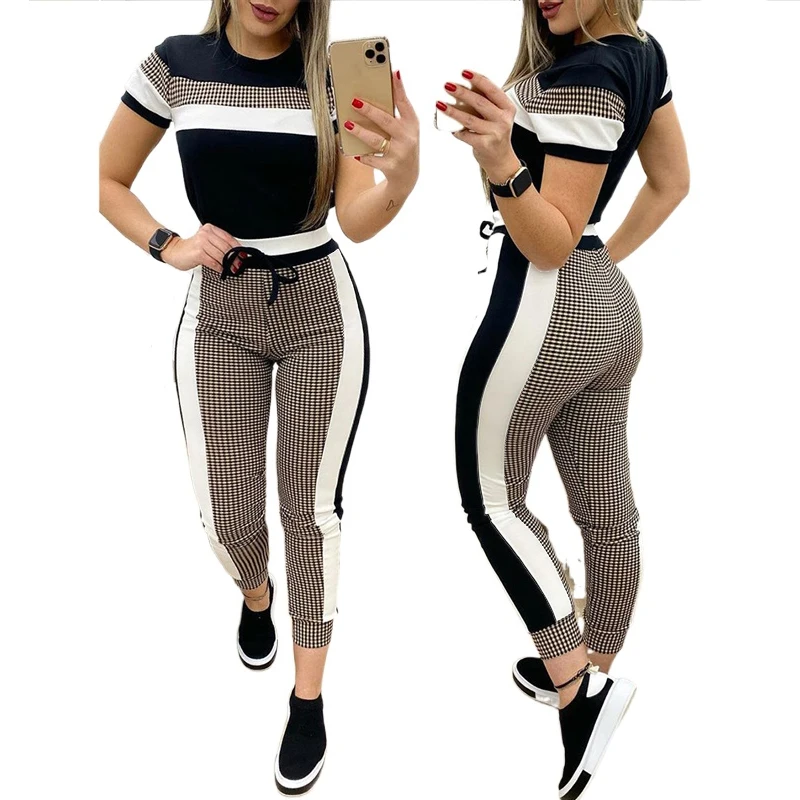 Женский костюм Donsignet, новый черный клетчатый костюм с коротким рукавом, повседневный пуловер с круглым вырезом, модные женские комплекты, весна-лето