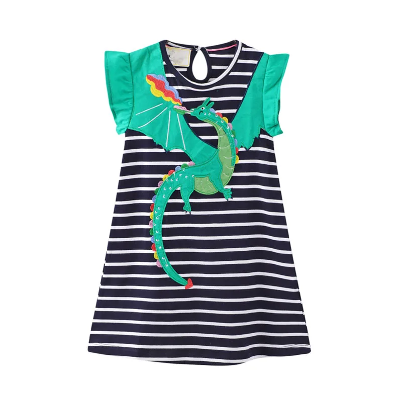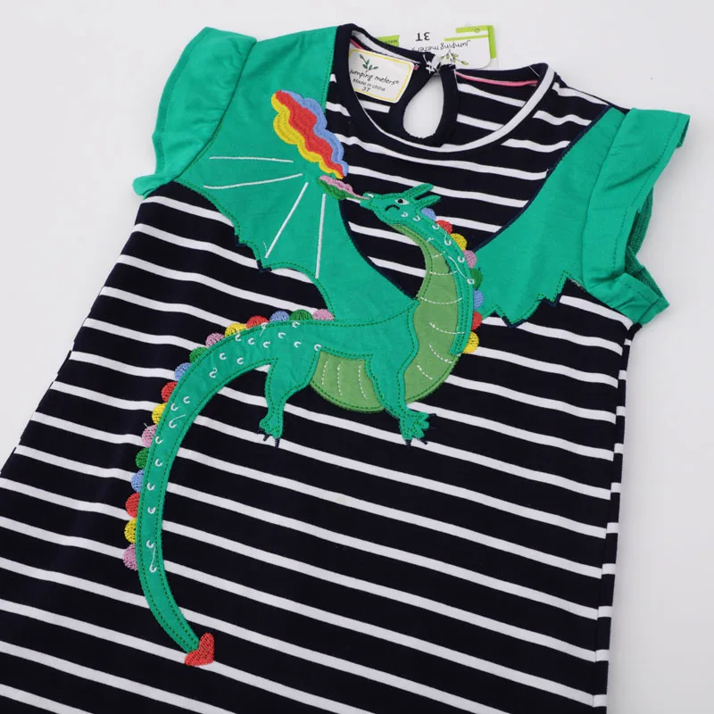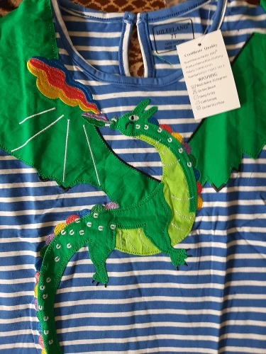 Платье отличное, размер подходит для 7 лет. NotaBene, мое платье заужено, чем указано ниже, с таблицей. Хлопковый материал, аппликация «дракон»-это эффект Вау. Кроме того, удалось купить до 20 злотых, и доставка была быстрой. Рекомендуем :)
