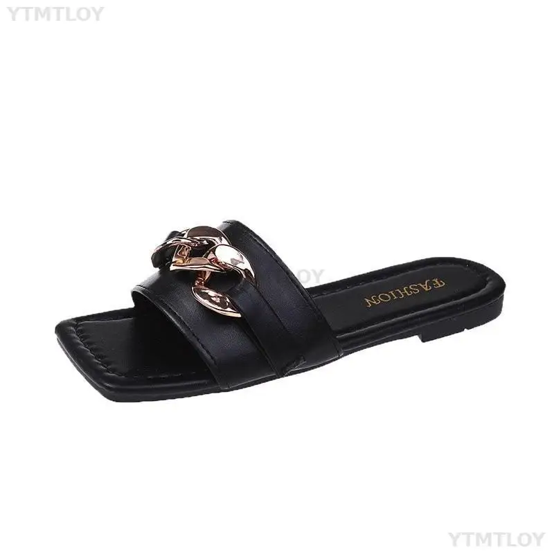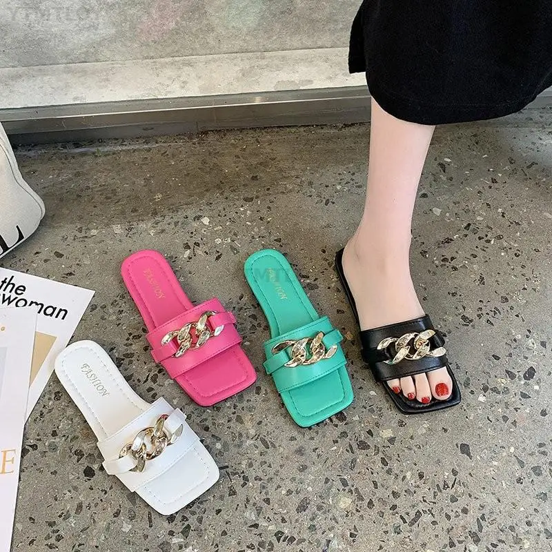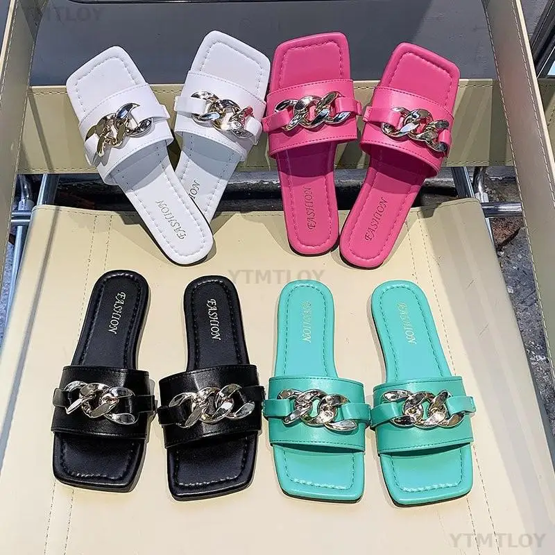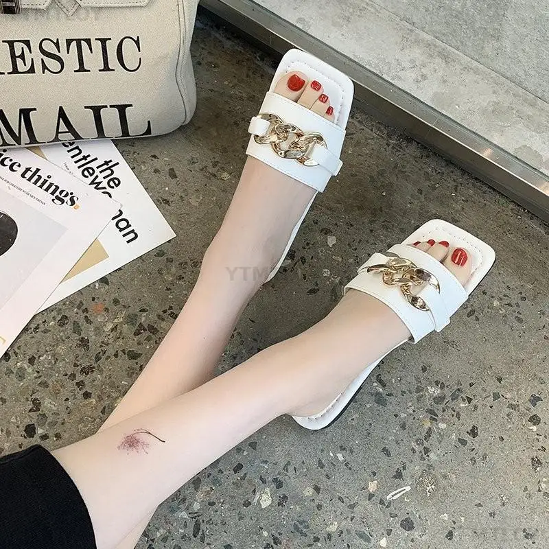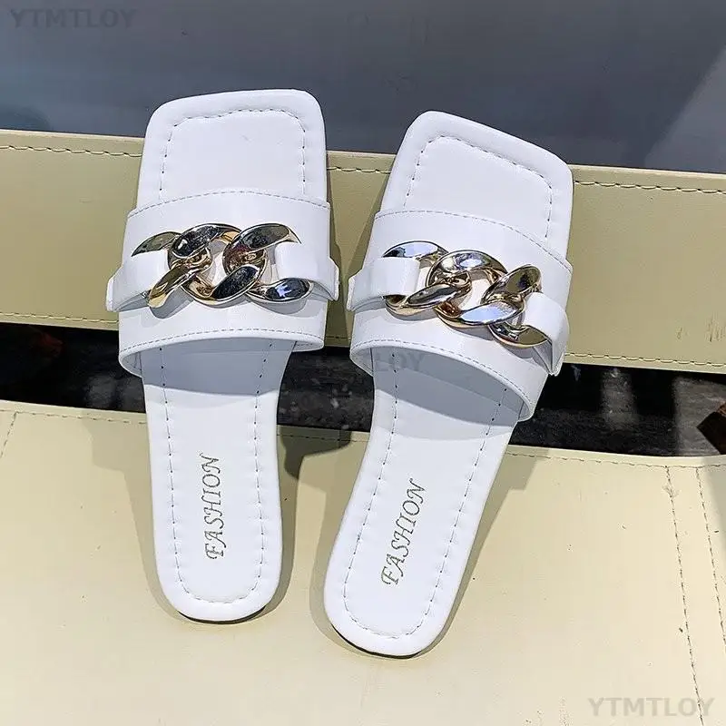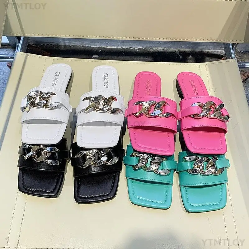 Женские шлепанцы без застежки, брендовые дизайнерские мюли с золотой цепочкой, дамские шлепанцы
