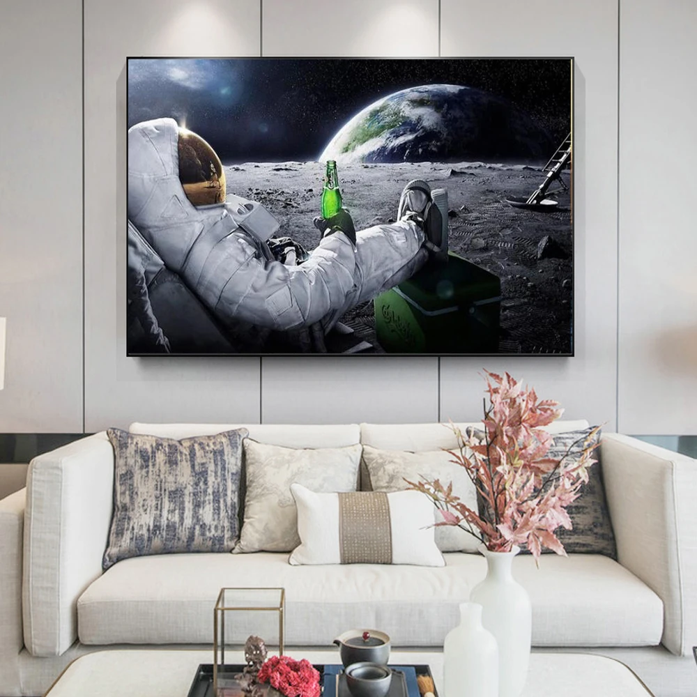 Смешные картины на холсте астронавт расслабляющий на космическом пространстве Луна питьевое пиво настенные картины HD печатные Плакаты для гостиной