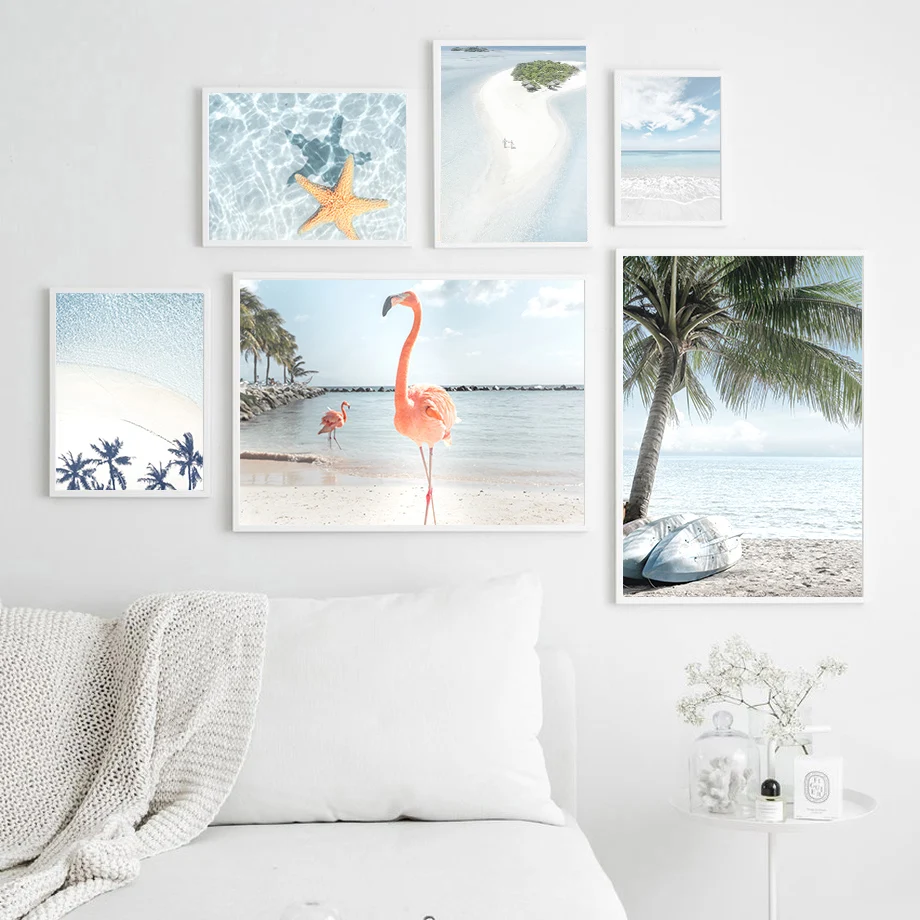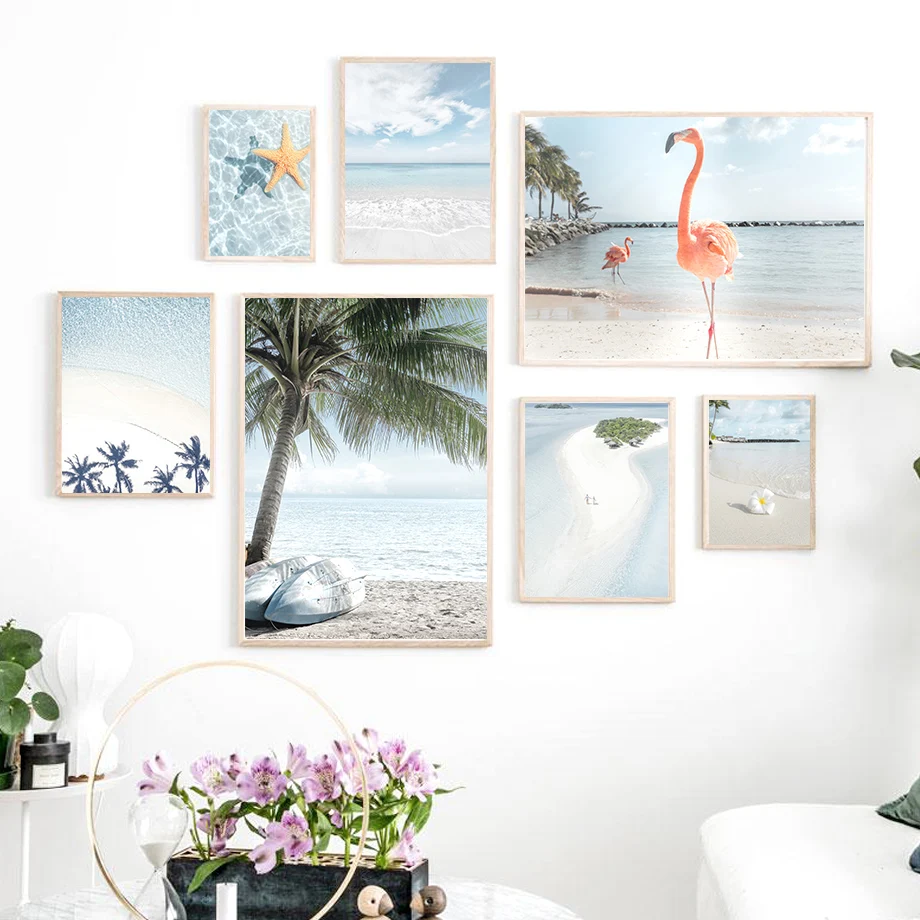 Настенная картина из тропического моря, пляжа, волны, фламинго, пальма, Картина на холсте, скандинавские плакаты и принты, настенные картины для декора гостиной