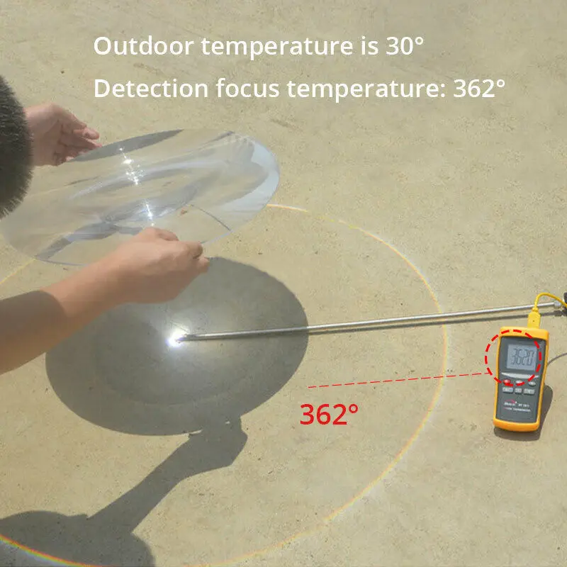 Температура фокуса в солнечный полдень может быть до 362 градусов при температуре на открытом воздухе 30 градусов.