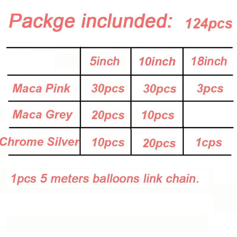 В комплект входит: 124 шт 5 дюймов розовый шар 30 шт 5 дюймов серый шар 20 шт 5 дюймов хром серебристый воздушный шар 10 шт 10 дюймов розовый шар 30 шт 10 дюймов серый шар 10 шт 10 дюймов хром серебристый воздушный шар 20 шт 18 дюймов розовый шар 3 шт. 18 дюймов хром серебристый воздушный шар 1 шт.