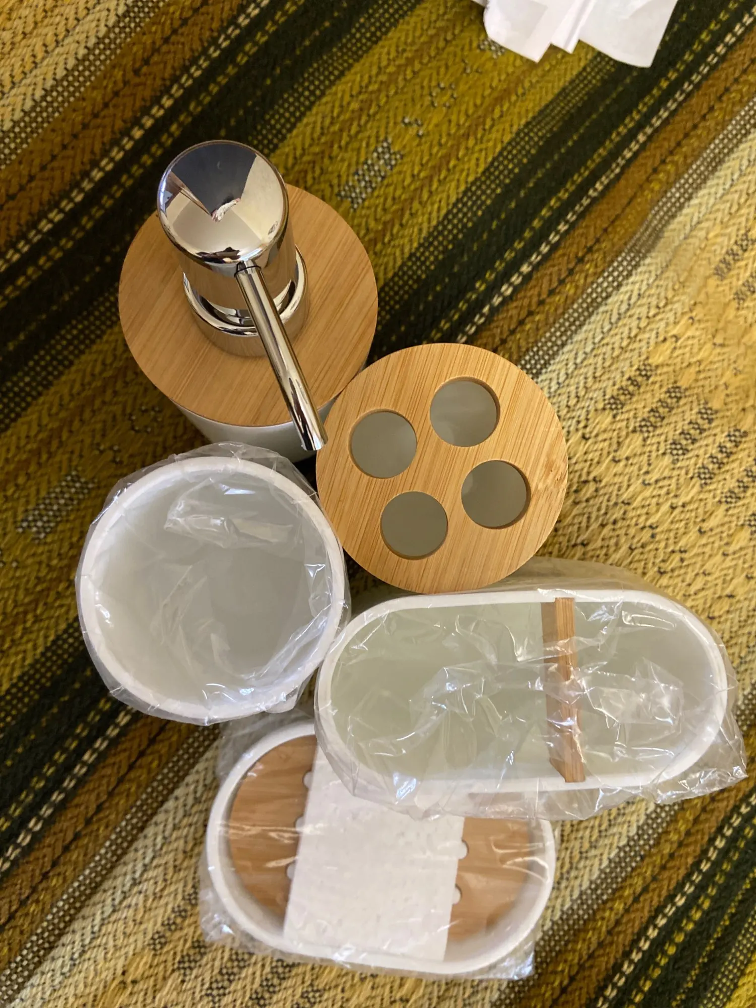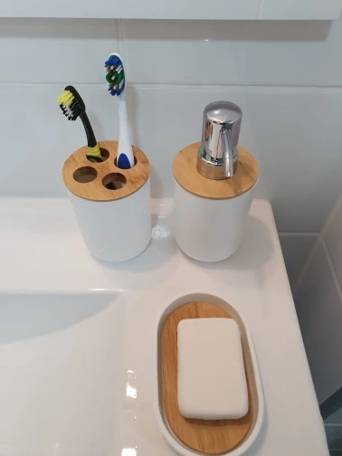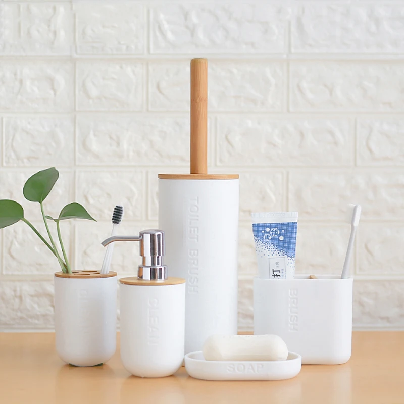 ОсобенностиИзготовлен из полипропиленового материала, экологически чистый и здоровый. Украшенный бамбуком и деревом, натуральный, элегантный и со вкусом.Держатель туалетной щетки: щетка с бамбуковой ручкой и ПП держатель основания. Герметичный дизайн, запах не подвержен воздействию.Мыльница: бамбуковые деревянные поддоны могут быть вывезены. Полый дизайн с функцией слива.Дозатор мыла: гладкие и гладкие насадки подходят для вашей ладони.Держатель зубной пасты: встроенная бамбуковая перегородка для разделения зубной пасты и зубной щетки. Бамбуковая перегородка может быть вывезена.Держатель зубной щетки: четыре части дизайна для зубной щетки до 4. Бамбуковая перегородка может быть вынута, затем держатель зубной щетки может использоваться в качестве чашки.ПримечаниеЭтот продукт не включает деревянные поддоны! Лоток только для шоу!