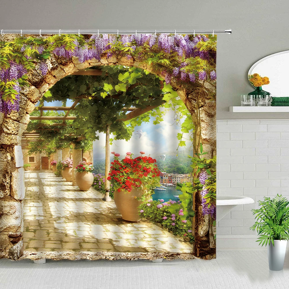 Занавеска для душа с изображением греческого города, улицы, цветов,...