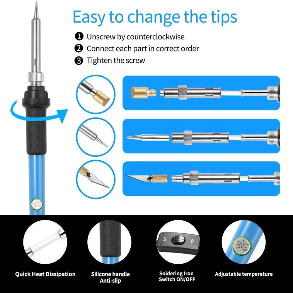 Материал: пластик + латунь + сталь Входное напряжение: 110 В/220 В переменного тока, 50-60 Гц Мощность: 15-60 Вт рабочая температура: 0-40 ° C диапазон температур: 200 °C-450 °C(392 °F-842 °F)