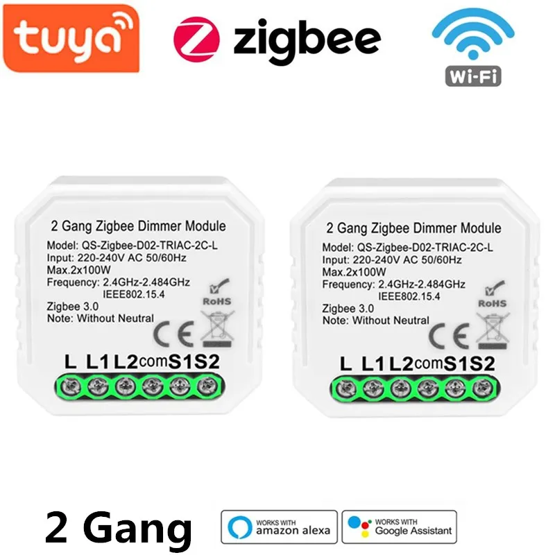 Умный переключатель ZigBee Tuya с Wi-Fi, диммер с 2 клавишами, без нейтрального провода, с голосовым управлением, работает с Alexa Google