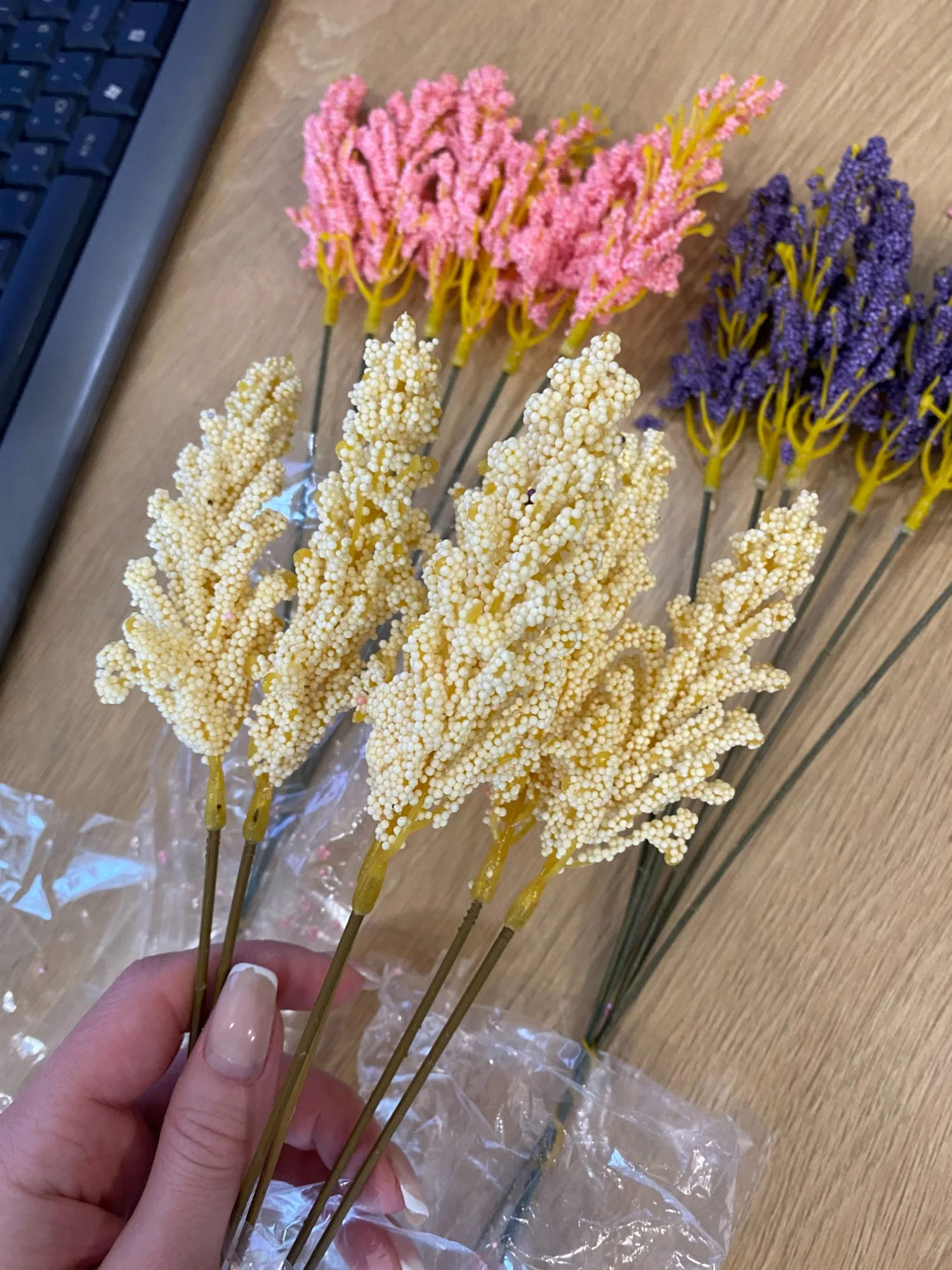 Товару до фото магазина далеко. Цветоносы из желтого пластика, который резко отличается от цвета стебля и бросается в глаза и очень много проплешин, не покрытых цветной крошкой. Да не соответствие по цвету заказанному, хотя на это можно было бы закрыть глаза, если бы не такие облезлые . Качество на крайне низком уровне