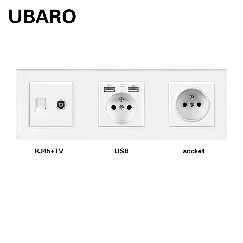 UBARO, французский стандарт, стальная стеклянная панель, настенная розетка с RJ45 RJ11, ТВ Сигал, клеммы, розетки, домашняя розетка, AC100-250V, 16А
