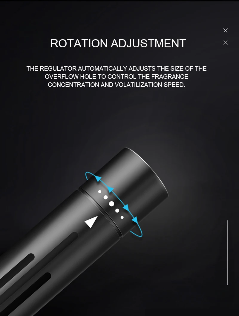 4. Уникальный механизм регулирования, вы можете вращать устройство аромата для контроля скорости испарения; Он открывается наиболее, когда указатель находится в середине шкалы