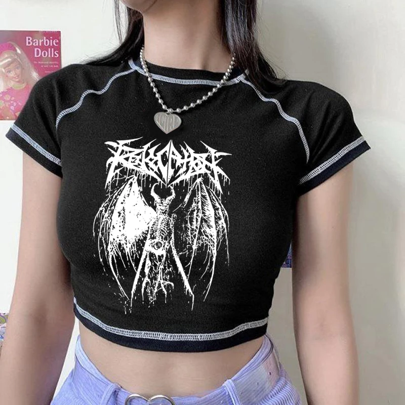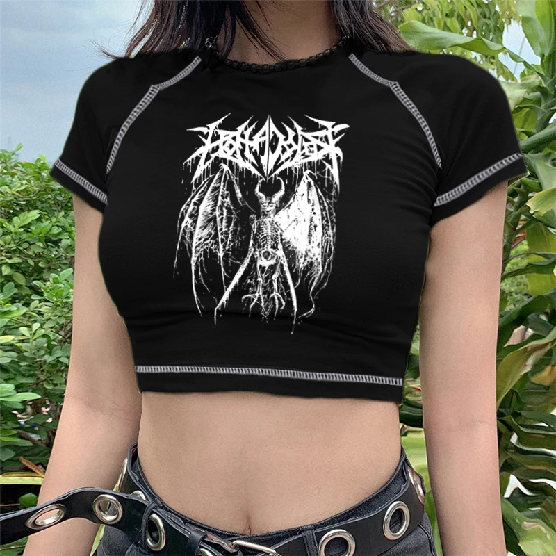 Женские футболки в стиле Харадзюку Y2K, кроп-топы в Корейском стиле, с черным демоном, с мультяшным принтом, в стиле панк, готика, аниме, облегающая Сексуальная темная одежда