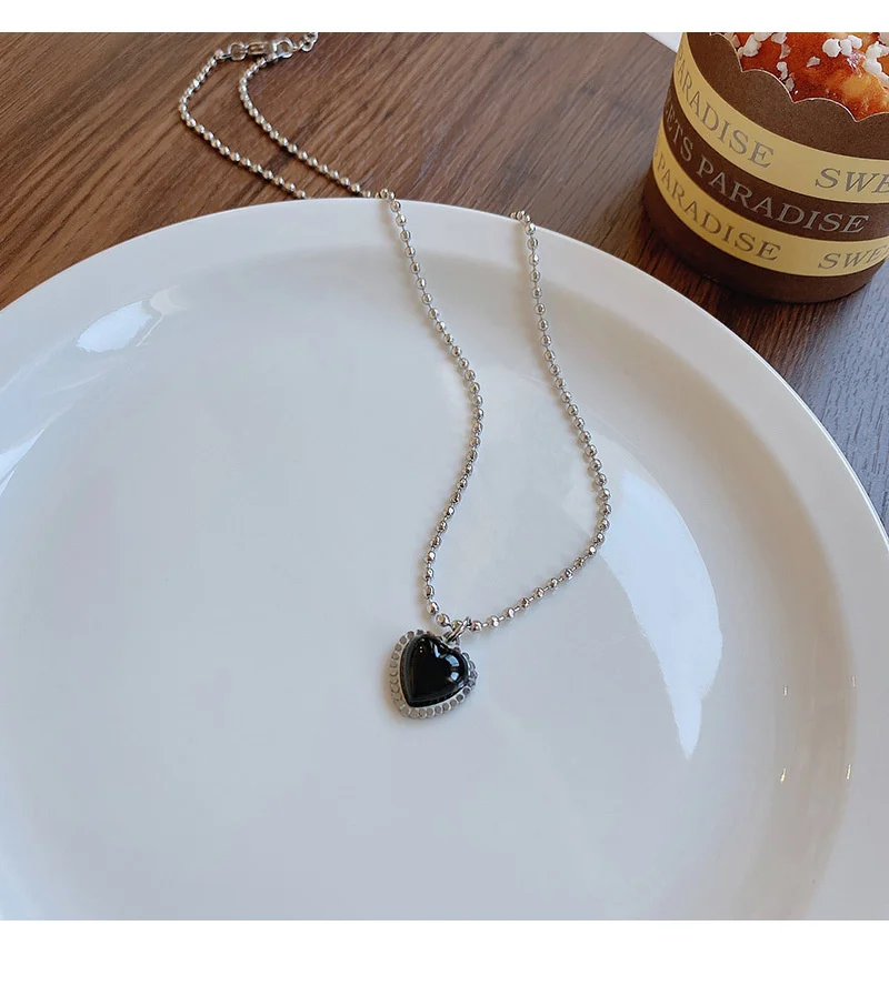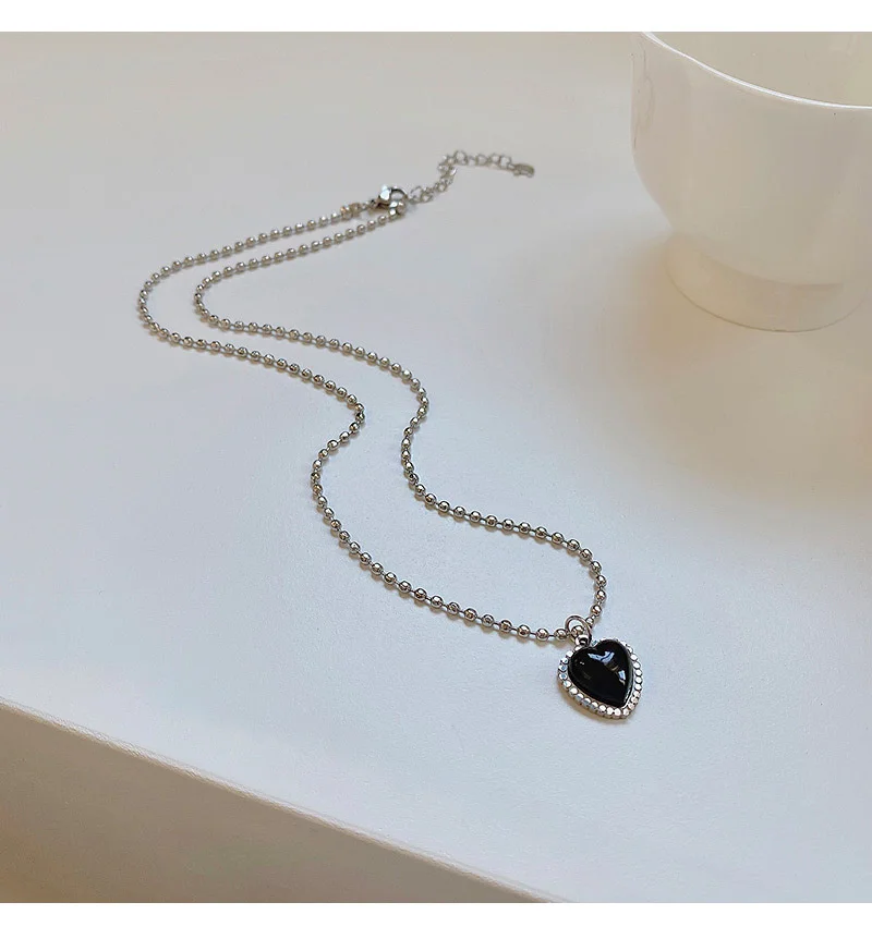 Женская цепочка с медальоном в виде черного сердца, винтажная титановая цепочка серебристого цвета, подарок для женщин, ожерелье из круглых бусин