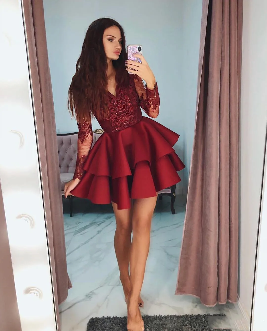 Коктейльное платье знаменитости, красивое красное платье с V-образным вырезом и длинным рукавом для встречи выпускников, стильное Многоярусное короткое Кружевное платье с аппликацией из бисера