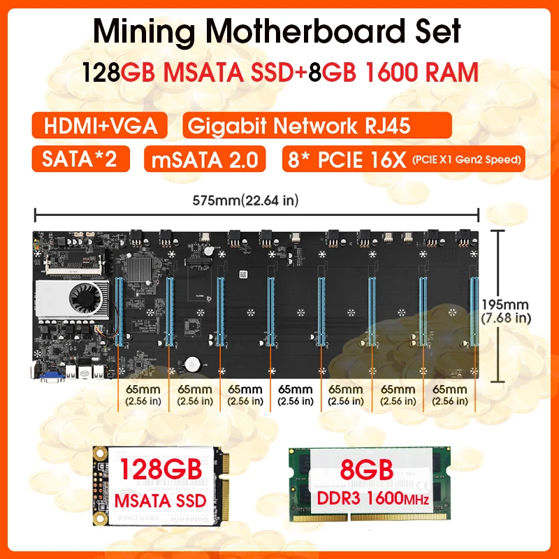 BTC-S37 8 GPU Биткоин криптография Ethereum Майнинг материнская плата с 128 ГБ MSATA SSD и 8 Гб DDR3 1600 МГц RAM