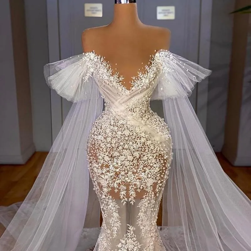 Прозрачное кружевное свадебное платье-Русалка с глубоким вырезом, с жемчугом и запахом, свадебное платье с иллюзией