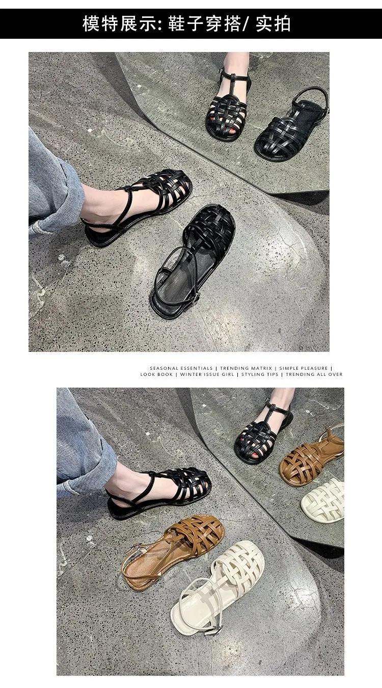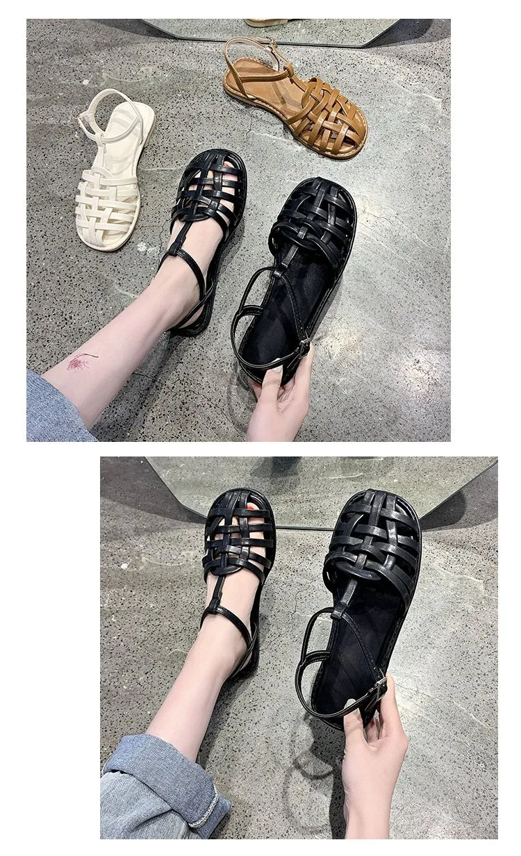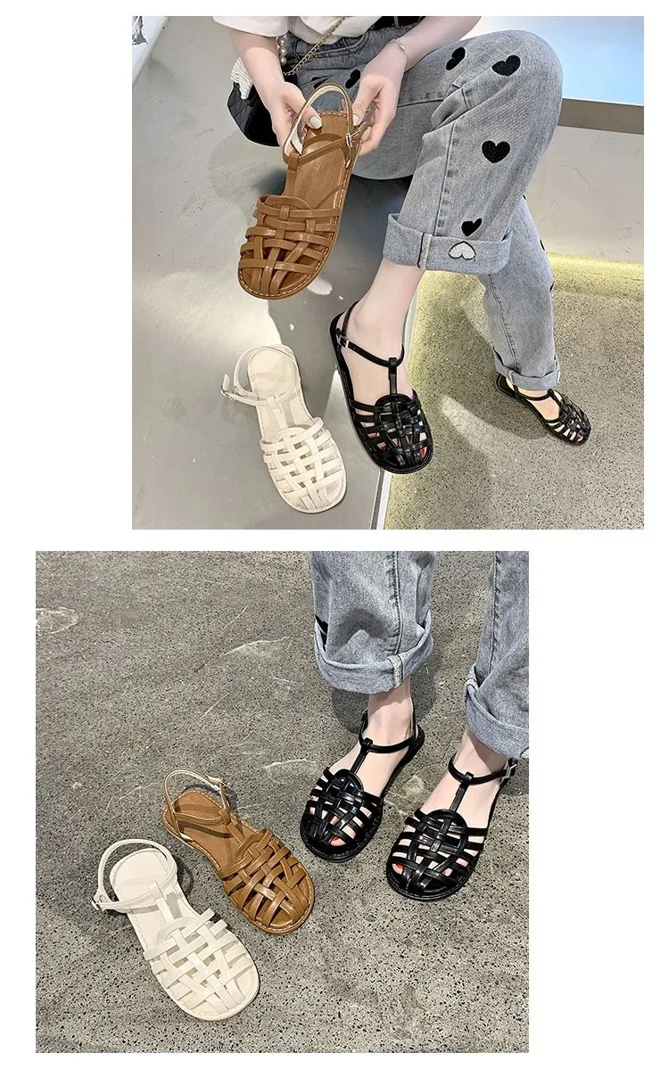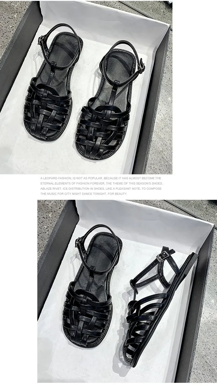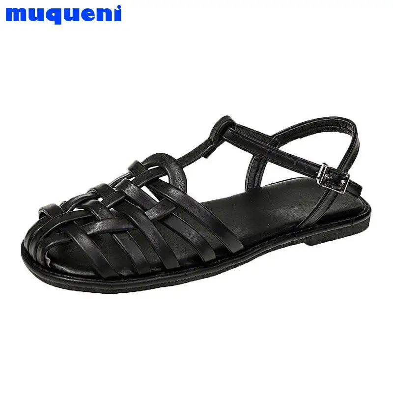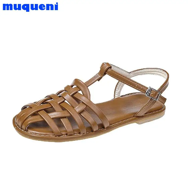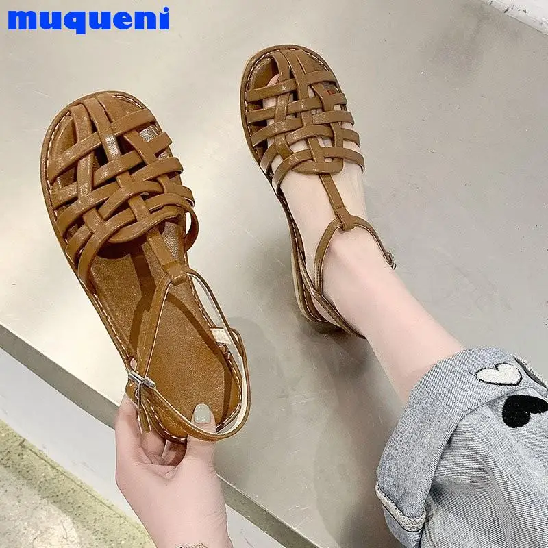 2021 г. Женские босоножки летняя повседневная женская обувь из натуральной кожи с вырезами на плоской подошве с круглым носком и Т-образным ремешком и пряжкой размер 35-40