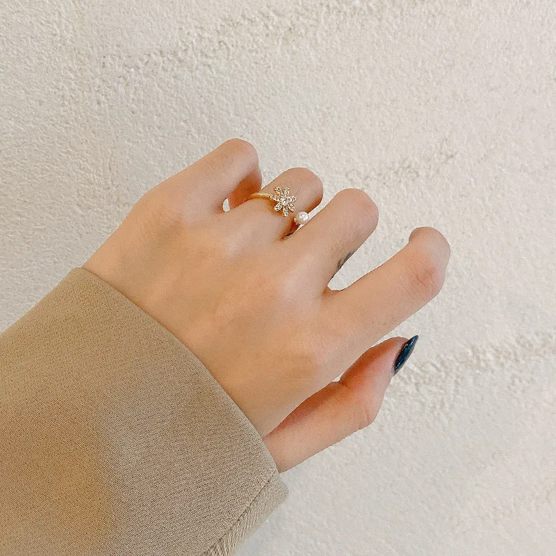 Корейский Стиль милый маленький жемчужное кольцо в форме цветка для женщин с украшением в виде кристаллов Циркон темперамент Регулируемая палец кольцо для девочек Свадебная вечеринка ювелирные изделия