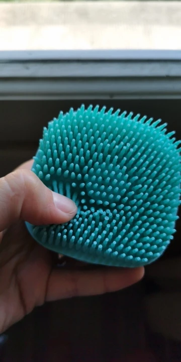 Мочалочка забавная,щетинка селиконовая очень мягкая.Пёсе думаю понравится.Пришло за 2 недели.