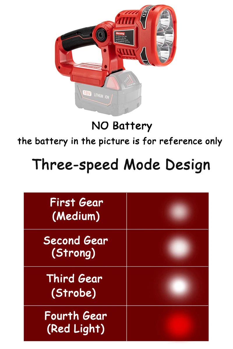 Спецификация:Мощность: 12 Вт Порт USB: 1Совместимая модель аккумулятора: подходит для литиевой батареи Milwaukee 18 вДля MILWAUKEE M1848-11-1811, 48-11-1815, 48-11-1820, 48-11-1822, 48-11-1828, 48-11-1840, 48-11-1841, 48-11-1850, 48-11-1852Примечание: аккумулятор 48-11-2200 V18 не поддерживаетсяПосылка входит: 1 * светильник (не включая батарею)Особенности:1. Четыре вида интенсивсветодиодный светильник да:Вы можете вручную отрегулировать интенсивность светильник продукта в соответствии с вашими потребностями, с четырьмя вариантами среднего светильник, сильного светильник, импульсной вспышки и светильник. Может применяться для различных сценариев, таких как ночной бег, кемпинг, чтение, ремонт предметов и т. д.2. Интерфейс USB:Аварийный фонарь имеет интерфейс USB, который можно использовать в качестве мобильного источника питания для смартфонов или других мобильных устройств, И используется в качестве аварийного источника питания для зарядки в полевых условиях или при отключении питания. Примечание: Не совместим с адаптерами выше 5 В3. Угол вращения:Угол поворота достигает 90 градусов, его можно установить гибко, чтобы максимально удовлетворить ваши потребности. Эргономичный дизайн ручки повышает ваш комфорт. Встроенный радиатор, высокая плотность и быстрое рассеивание тепла