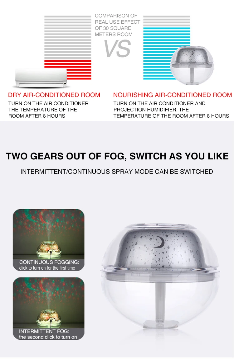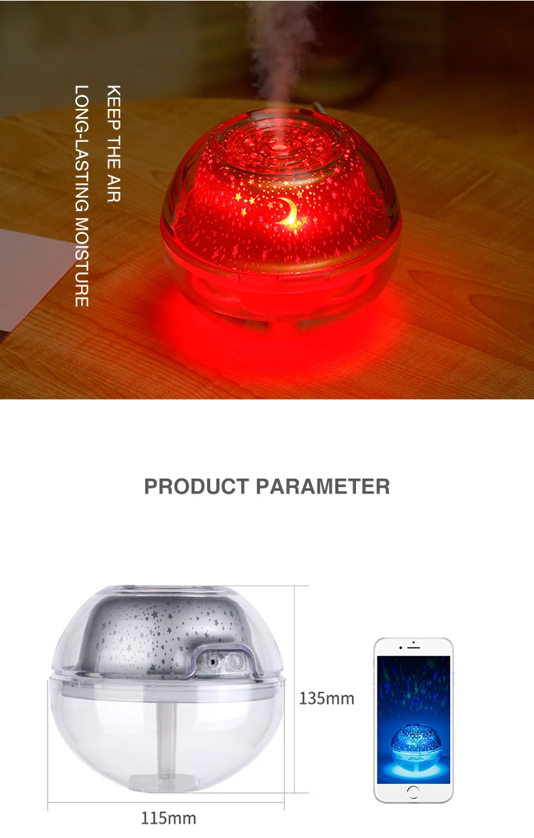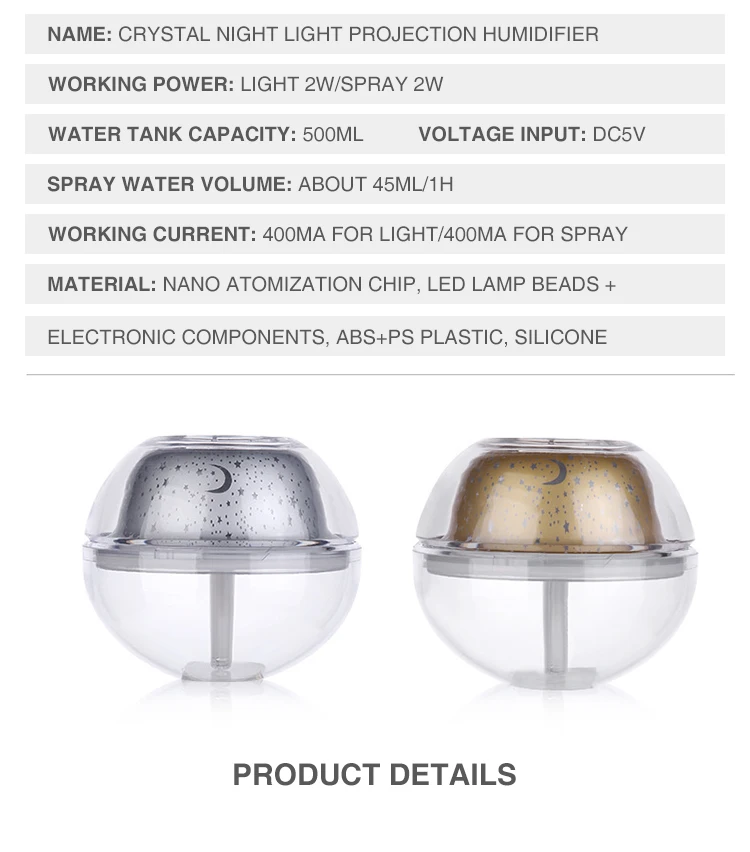 Рабочий ток: около 400 мА/спрей около 400 мАЕмкость резервуара для воды: 500 млРазмер изделия 135*135*115 ммПосылка: проекционный увлажнитель, usb-кабель для зарядки, стержень из хлопка, руководство пользователя