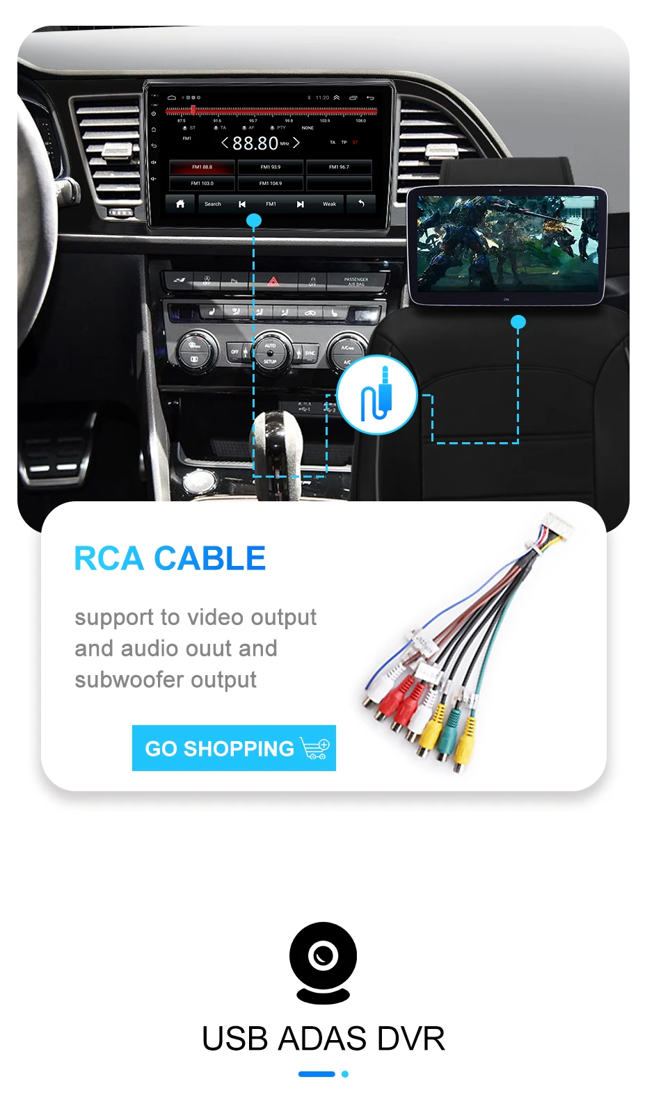 >>> Поддержка входа видео / AUXПоддержка видеовыхода, вы можете смотреть видео на внешнем монито ре, таком как монитор подголовника, потолочный монитор (кабель RCA н е входит в комплект, можно нажать, чтобы купить)