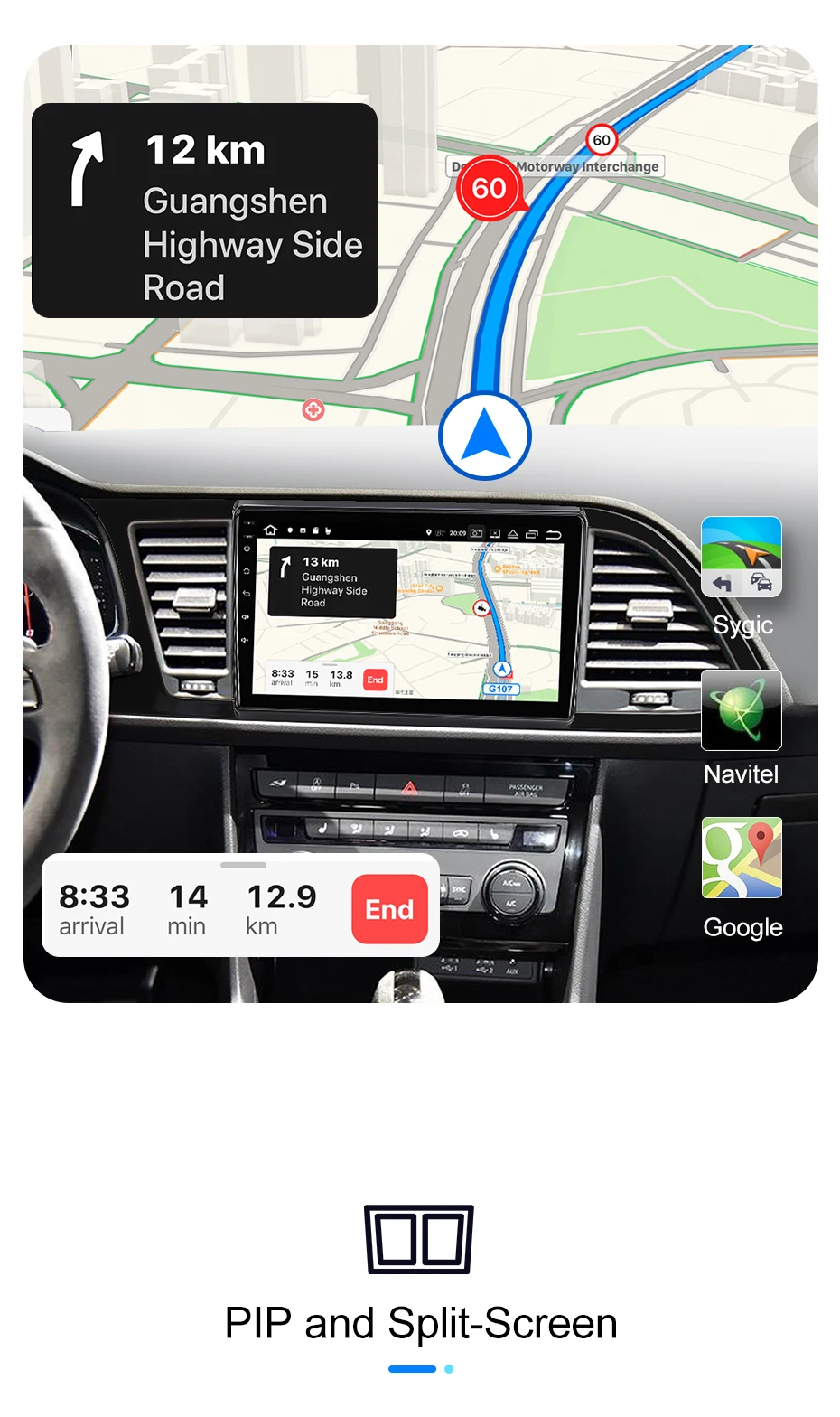 Картинка в картинке и разделенный экран>>> Видео всегда отображается во вложенных окнах, вы можете установ ить размер видеоинтерфейса по своему усмотрению.>>> Экран головного устройства может отображать два приложения одновременно. (не может одновременно отображать два аудио приложения)