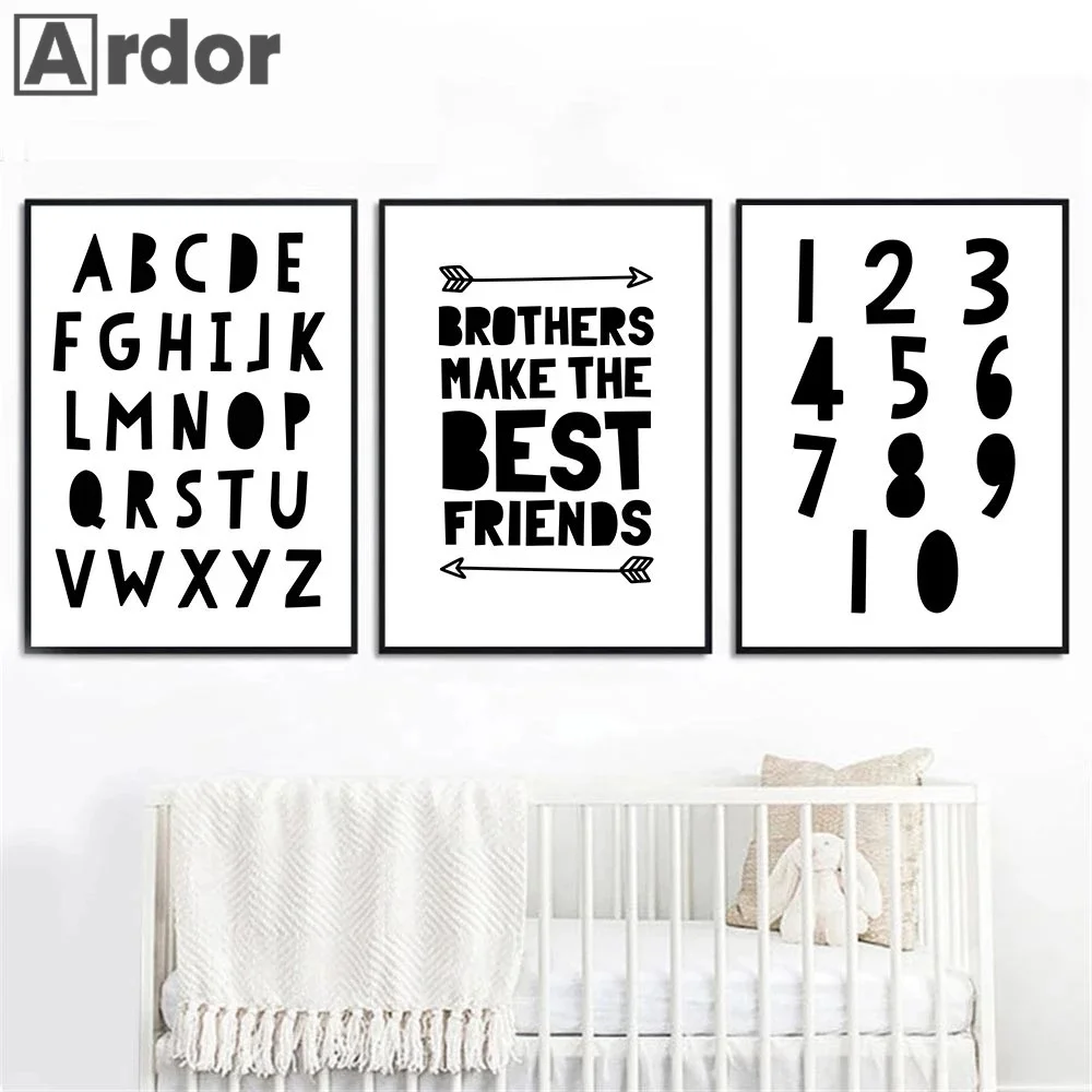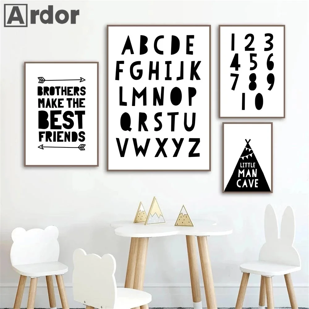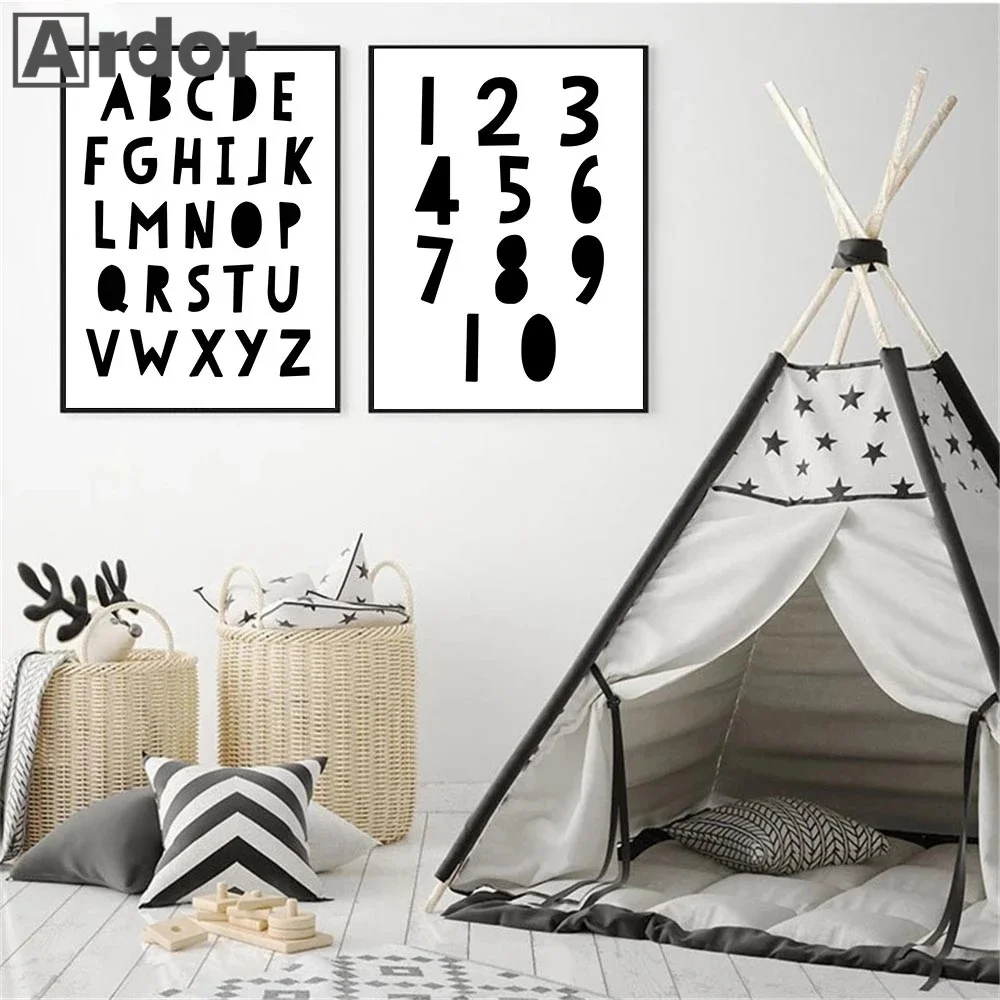 Настенный постер с буквами ABC для детской комнаты, Художественная Картина на холсте с арабскими цифрами, черные и белые цитаты, декор для детской комнаты