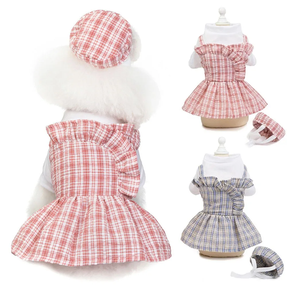 Новая Летняя Одежда для питомцев, милые с рисунком щенка, платье принцессы платье из тонкого хлопка плед маленькая собака платье со шляпой, чихуахуа юбка кошка костюмы