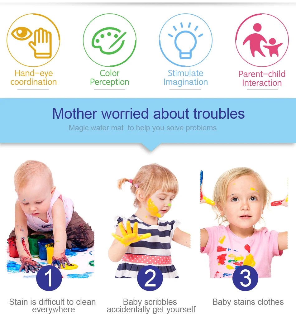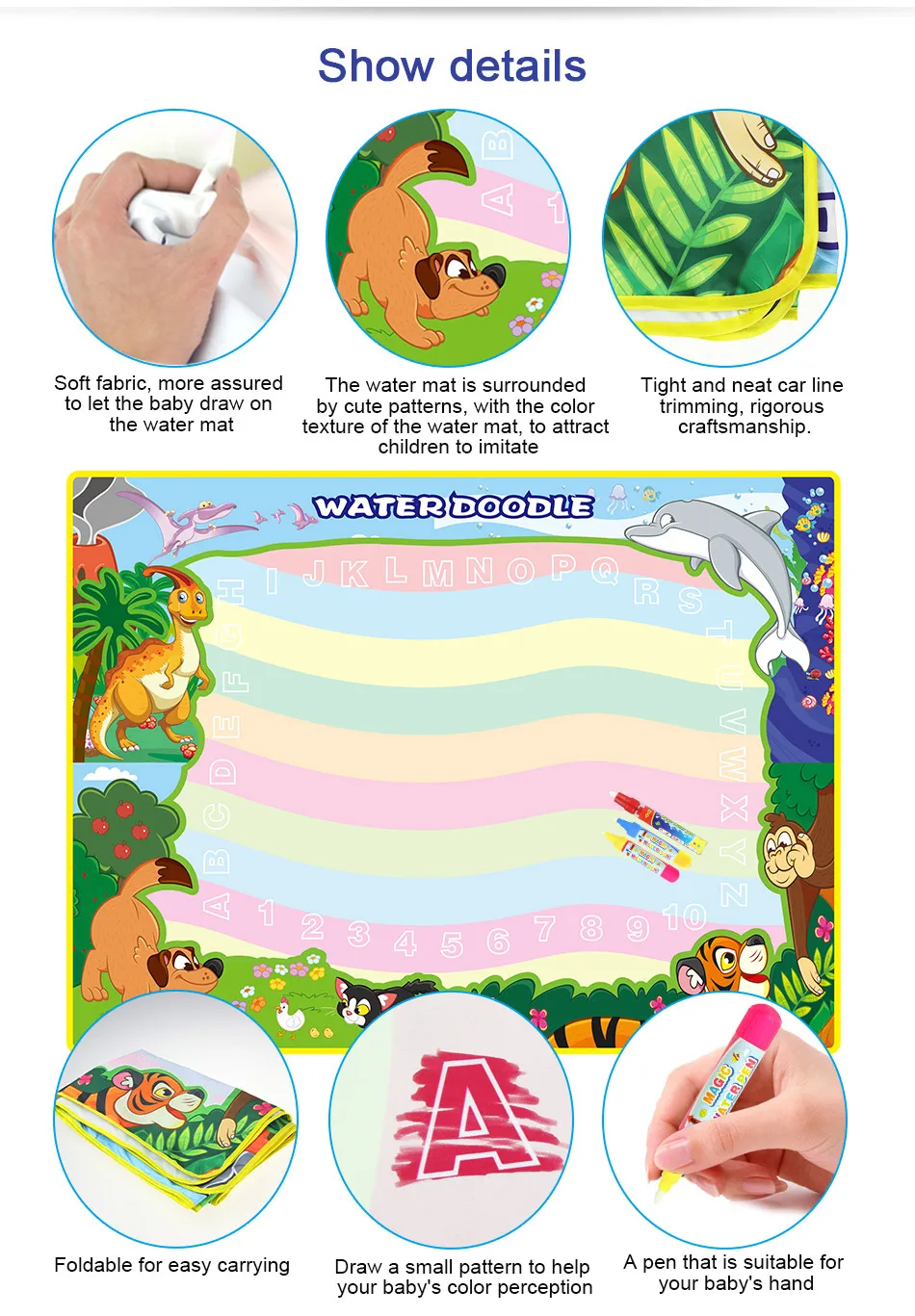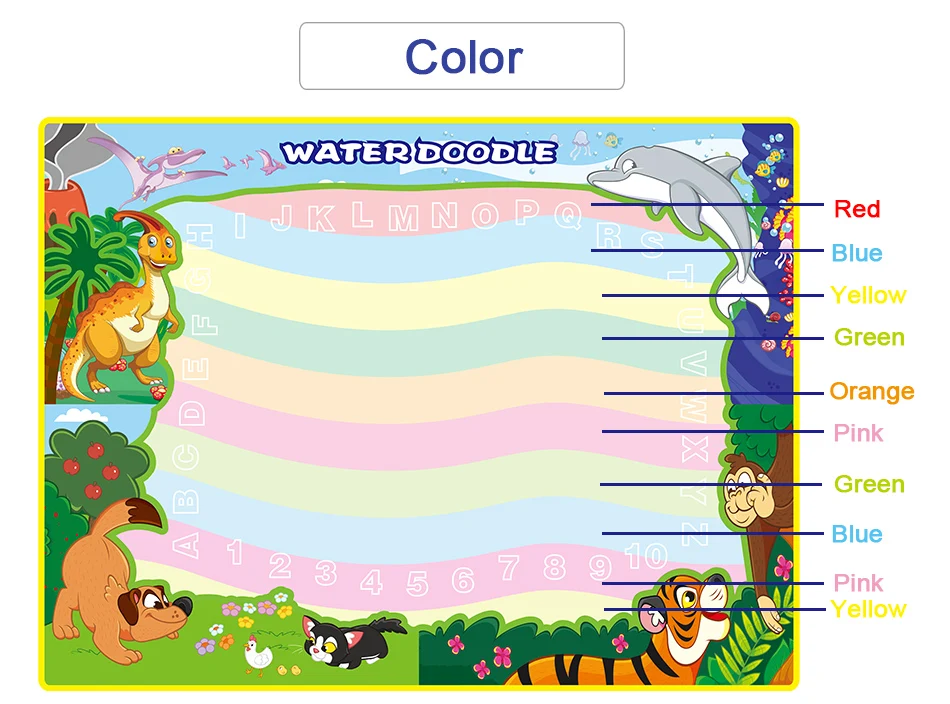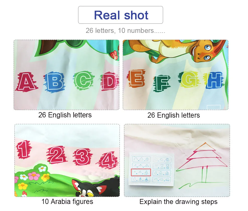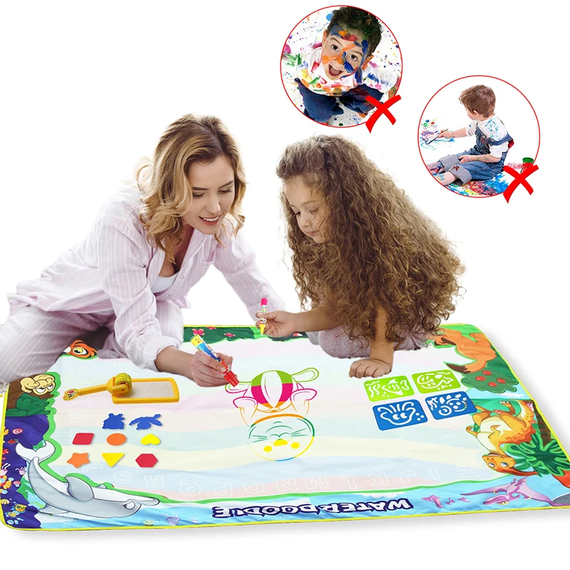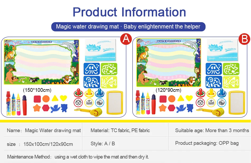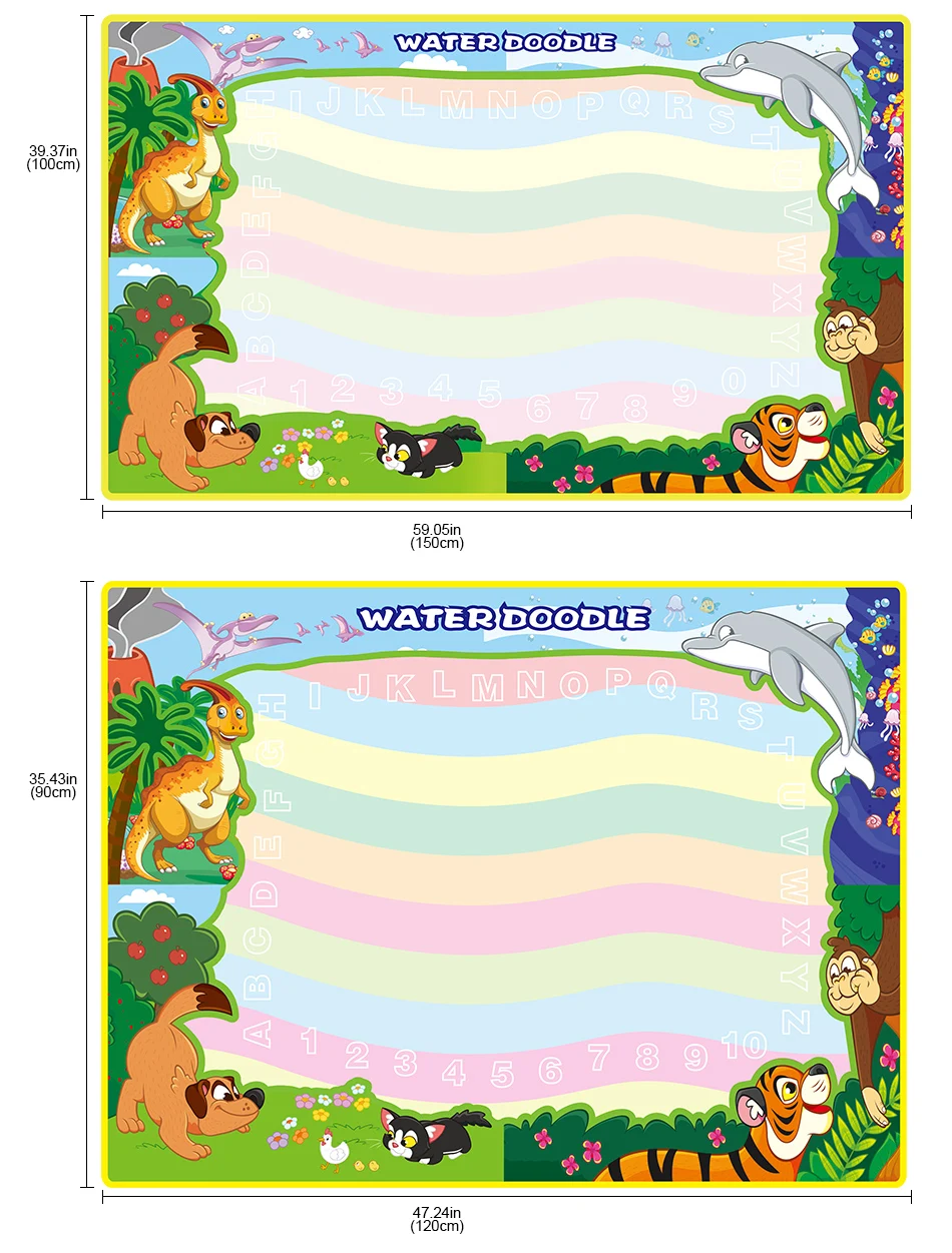 Материал: тканьРазмер:A:150x100 смB:120x90 смХарактеристика:Материал: экологически чистый, высококачественный, водонепроницаемый, без чернил, без химических веществ.Функция: образовательная, пригодная для повторного использования.Просто нужно заполнить водой, чтобы рисовать, и он исчезнет после нескольких minitus, дети могут каракули его снова и снова, родители больше не волнуйтесь беспорядок.