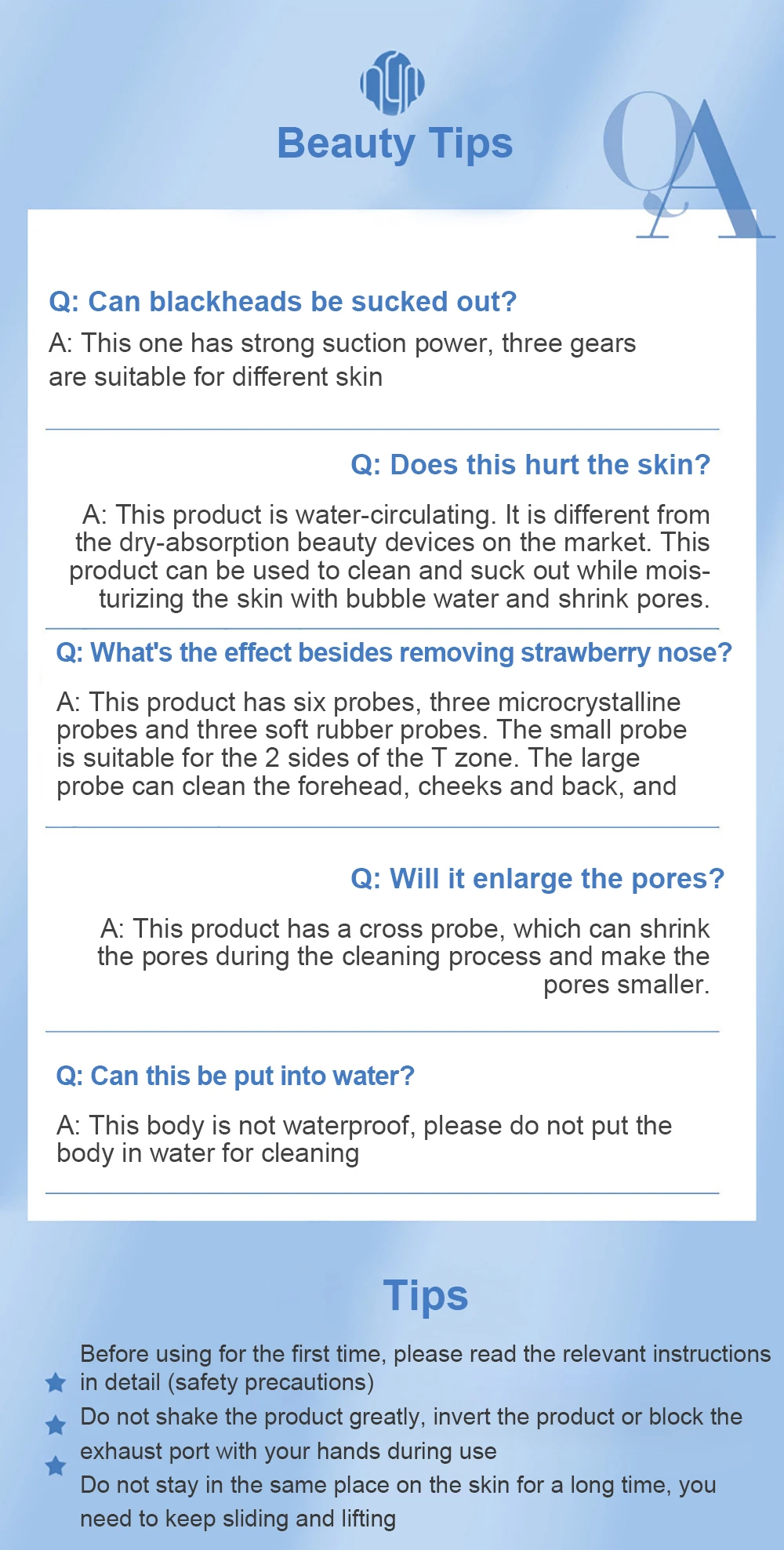 В: Можно ли высасывать черные головки?О: Это устройство имеет сильную мощность всасывания, и его три шестерни подходят для различных типов кожи.Вопрос: это повредит кожу?О: Этот продукт циркулирует в воде. Он отличается от косметических устройств для сухой абсорбции на рынке. Его можно использовать для очистки и высасывания, увлажняя кожу с пузырьковой водой и сужая поры.В: какой эффект он имеет, кроме удаления внешнего вида клубничного носа?О: Этот продукт имеет 6 зондов: 3 микрокристаллических зонда и 3 мягких резиновых зонда. Небольшой зонд подходит для 2 сторон Т-зоны. Большой зонд может очистить лоб, щеки и спину.В: увеличит ли он поры?О: Этот продукт имеет перекрестный зонд, который может сужать поры во время процесса очистки и уменьшать поры.Вопрос: Можно ли положить его в воду?О: корпус не является водонепроницаемым; Пожалуйста, не помещайте тело в воду, чтобы очистить его.
