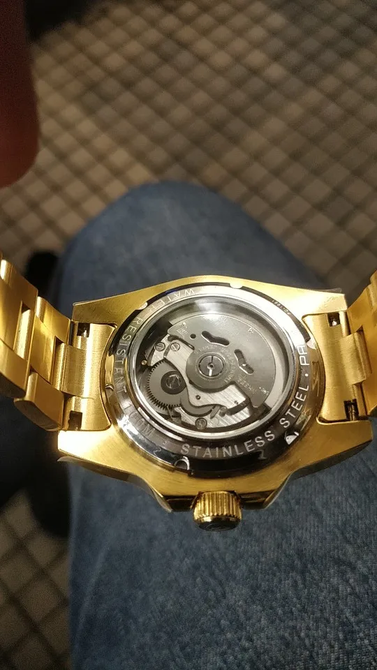 Часы прибыли со сломанным винтовым штифтом, а пылающий пип в ободке зеленый, в то время как другие маркеры и руки lume-синие. Я пожаловался продавцу, но до сих пор не было эффективных решений.
