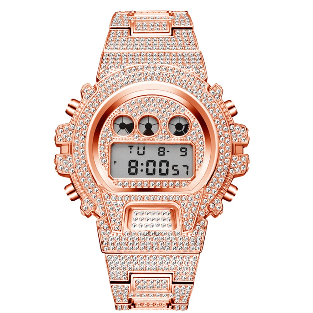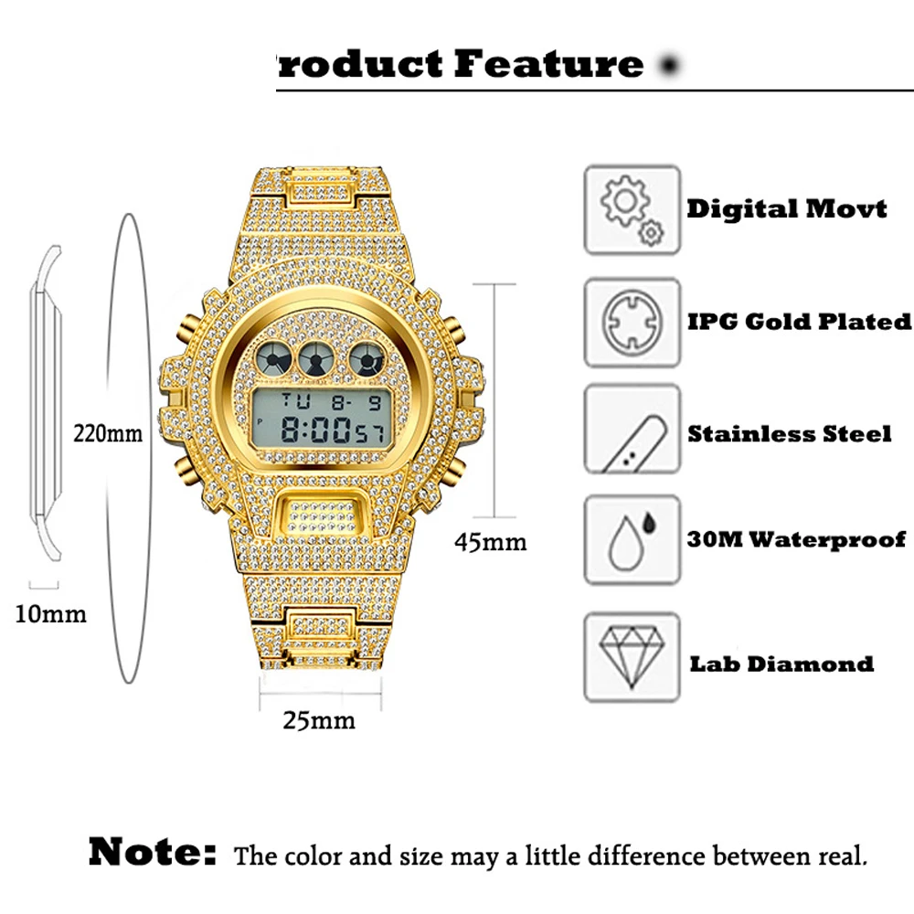 Часы наручные мужские с бриллиантами, цифровые водонепроницаемые светодиодсветодиодный спортивные, в стиле хип-хоп, под 18-каратное золото, 10 шт.