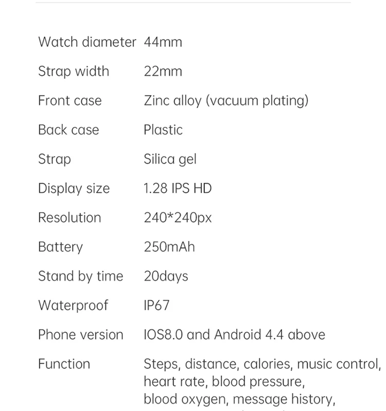 Носимые устройства отслеживают деятельность человека с помощью электронных датчиков, и они находятся на уровне электуоники потребителя. Это нормально для определенного отклонения. Пользователь должен рассматривать данные объективно.1. Пожалуйста, не сравнивайте с больничным оборудованием для чтения, это не медицинское устройство! Только для общего здоровья и фитнеса.2. Перед использованием отсканируйте qr-код в руководстве, чтобы загрузить приложение и подключить его к часам с помощью приложения.3. Для пользователя Android: пожалуйста, всегда разрешайте доступ приложения ко всем функциям телефона и Всегда позволяйте ему работать. И, пожалуйста, включите bluetooth на вашем телефоне, прежде чем подключить его.4. Пожалуйста, заряжайте его при получении. После длительной доставки у него не было электричества. Спасибо!5. Все умные часы в нашем магазине не поддерживают зарядку с помощью быстрого зарядного устройстваВысокое напряжение зарядки вызовет короткое замыканиеНормальный зарядный ток должен быть в пределах 300 мА · ч, чтобы продлить срок службы батареи6. Быстрое зарядное устройство:Если вы не использовали Смарт-часы в течение длительного времени после его получения, вы можете использовать быстрое зарядное устройство около 5 минут, чтобы активировать его. Другие случаи не допускаются7. Если у вас есть какие-либо вопросы после получения продукта, пожалуйста, немедленно свяжитесь с нами. Из-за разницы во времени, мы ответим вам сразу после просмотра вашей информации. Мы всегда сделаем все возможное, чтобы помочь вам.