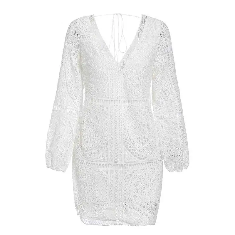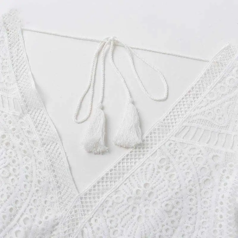 Пикантные, с бисером, открытая спина, без бретелек, купальные летние платья белое кружевное платье для женщин Туника халат Винтаж с v-образным вырезом boho vestidos размера плюс