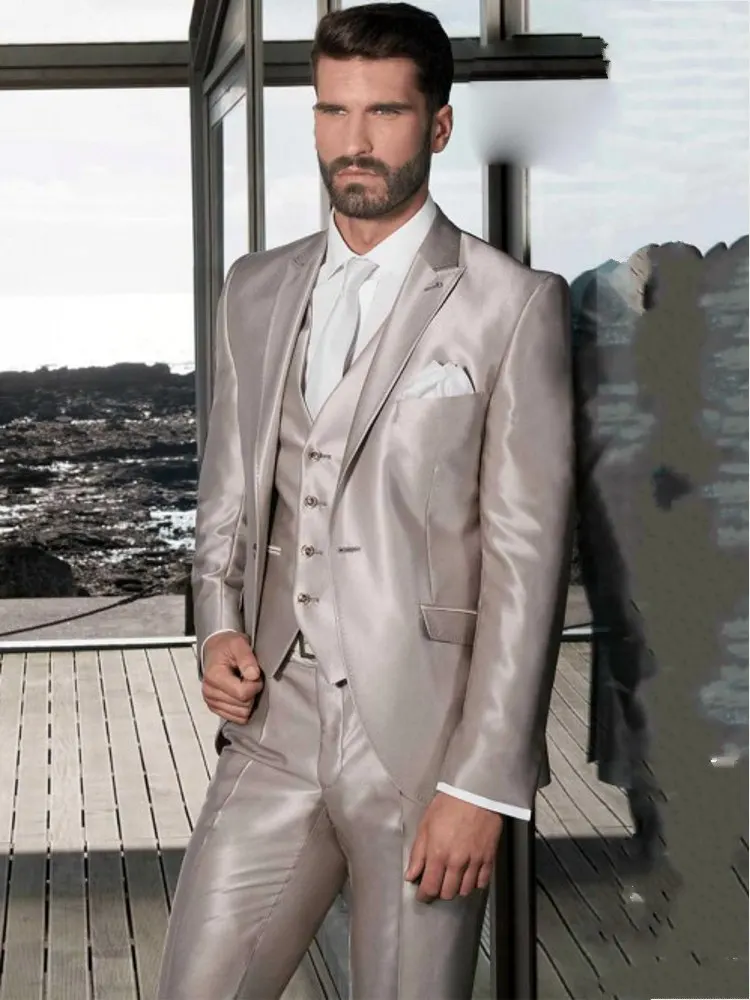 Блестящие бежевые Красивый смокинг для жениха тонкий подходит для мужских вечернее платье тосты костюм вечерние Блейзер одежда (куртка + брюки + жилет + галстук-бабочка) NO:091