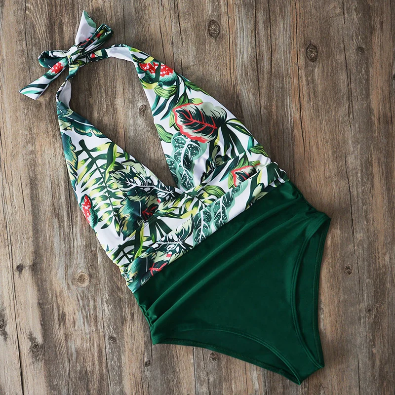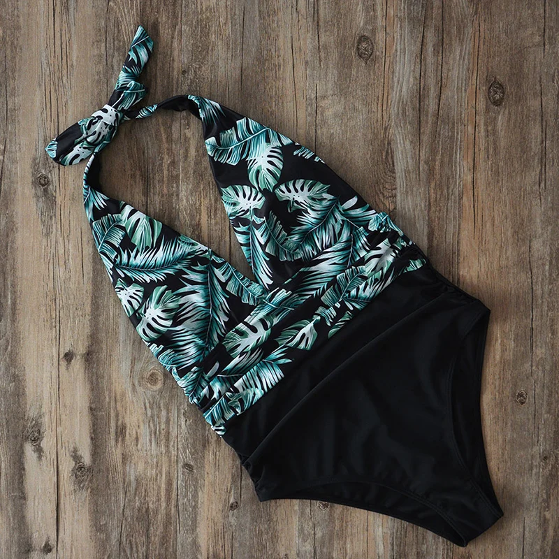 Пальмовых листьев печати Одна деталь купальники Для женщин 2021 Высокая Талия, купальник с подкладкой, с низким вырезом на спине бразильские ванный комплект Монокини размера плюс 2XL