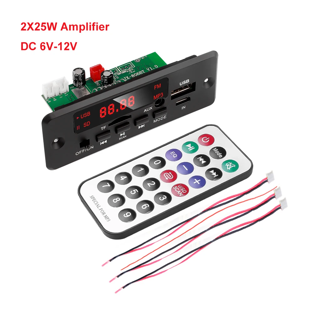 Модель усилителя 2x25 ВтХарактеристики:1. Bluetooth версии 5,02. Поддержка вызовов (нажмите и удерживайте кнопку паузы, чтобы ответить на вызов при поступлении входящего вызова).3. Поддержка записи. Запись поддерживается только в режиме TF или в режиме USB.(Нажмите и удерживайте кнопку MODE, чтобы начать запись, и удерживайте кнопку MODE еще раз, чтобы отменить запись и воспроизвести файл записи; Выйдите из режима записи и удерживайте кнопку паузы, чтобы выйти. При записи необходимо подключить накопитель, например: U-диск или TF-карту;)4. Поддержка памяти при отключении питания6. Напряжение питания поддерживает между DC6v-12v, а ток между 1-3A.7. Может быть напрямую подключен к динамику, с усилителем мощности и функцией Расшифровка Bluetooth.8. Поддержка форматов песен MP3 / WAV / APE / FLAC9. Основные функции MP3/USB/TF/линейный вход/FM/BLUETOOTH/пульт дистанционного управления/10. Мощность 50 Вт, true stereo 2*25 Вт.11. Поддержка выбора и воспроизведения папок. Когда воспроизводится USB или TF, когда в устройстве находится папка и в папке есть песни, дважды нажмите предыдущую или следующую кнопку, чтобы выбрать папку для воспроизведения песни, и на экране отобразится F001-F00N
