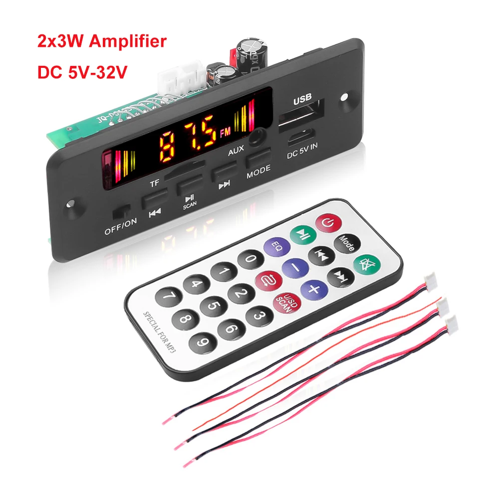 Усилитель 2X3 ВтОписание:С модулем аудиоприемника bluetooth, когда сотовый телефон и модуль bluetooth совпадают, MP3 или неразрушающие файлы APE через bluetooth отправляются на продукт модуля bluetooth-приемника для воспроизведения, что значительно помогло функции продукта и развлечений. Этот продукт также похож на обычную плату декодера MP3, воспроизводит U-диск или MP3-файлы с TF-картой, а также на радио-трансляцию.Особенность:USB: подключение к U-диску (максимальная поддержка 32 ГБ, не входит в комплект)СВЕТОДИОДНЫЙ цветной экран: цифровой экран, красный экранИнфракрасный приемный модульTF: подключение к TF-карте памяти (максимальная поддержка 32 ГБ, не входит в комплект)AUX: интерфейс аудиовходаVOL-: короткое нажатие-это последняя песня; Длительное нажатие-для уменьшения громкостиВоспроизведение/пауза: короткое нажатие-это переключатель между паузой и воспроизведением; Долгое нажатие-автоматическая станция FM-радио.VOL +: короткое нажатие-это выбор следующей песни; Длительное нажатие-Увеличение громкости.Режим: Переключение USB/TF/FM/линейный вход/BLUETOOTH ГолосИС Bluetooth: Bluetooth 5,0Формат музыки: MP3/WMA/WAV/FLAC/APEМощность: 2*3 Вт, подключается к двум динамикам 3 ВтFM-радио частота: 87,5-107,5 МГцВведение функций поддержки: поддержка MP3/USB/TF/линейный вход/FM/BLUETOOTH/пульт дистанционного управления/DC 12VО структуре: Размер панели: 93 мм * 36 мм, угол панели и положение отверстия под винт, затем поверхность покрытия, глубина доски составляет 33 мм