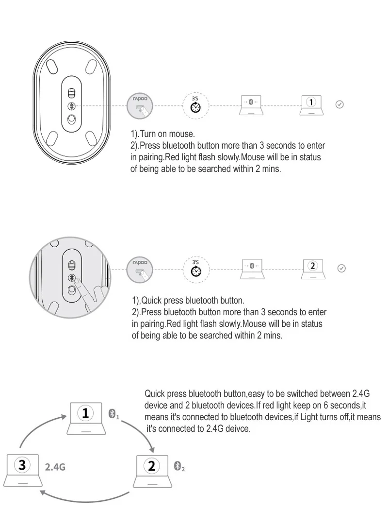 Модель 2,4G1. Подключите приемник Rapoo.2. Включите мышь. Модель BluetoothО: сопряжение первого устройстваA1.включите мышьA2.удерживайте нажатие на кнопку переключения, по крайней мере, 3 секунды для сопряжения.Светодиодный индикатор состояния медленно мигает красным. Мышь обнаруживается в течение 2 минут.A3.полное соединение с Bluetooth на вашем устройстве:Windows 7 и 8:(1) Нажмите кнопку «Пуск», затем выберите Панель управления> Добавить устройство.(2) выберите «Rapoo BT3.0 Mouse» или «Rapoo Ble Mouse» из списка, затем нажмите next. Windows 10:(1) Нажмите кнопку «Пуск», затем выберите Настройки> устройства> Совместимость с Bluetooth.(2) выберите «Rapoo BT3.0 Mouse» или «Rapoo Ble Mouse» из списка, затем нажмите Pair. B: сопряжение второго устройстваB1.нажмите кнопку переключения, чтобы переключиться на другой канал.B2.выполните шаг a2 и a3 «сопряжение первого устройства» для подключения второго устройства. Состояние светодиодный:Когда вы берете мышьЕсли красный светильник станет стабильным в течение 6 секунд, совместимое с Bluetooth устройство 1 сопряжено.Если красный светильник медленно мигает, совместимое с Bluetooth устройство 2 сопряжено.Если светильник выключен, 2,4 ГГц устройство работает в паре. Переключение между парными устройствамиНажмите кнопку, совместимую с Bluetooth, чтобы переключиться на 3 сопряженных устройства(Подключение с погрешностью в пределах 2-х устройства через Bluetooth-Совместимость с операционными и 1 через 2,4 GHz приемник) Низкая батареяКрасный светильник мигает дважды каждые две секунды при использовании мыши. Системные требованияWindows XP/Visa/7/8/10 или более поздняя версия, usb-порт ГарантияУстройство имеет ограниченную гарантию на один год с момента покупки.