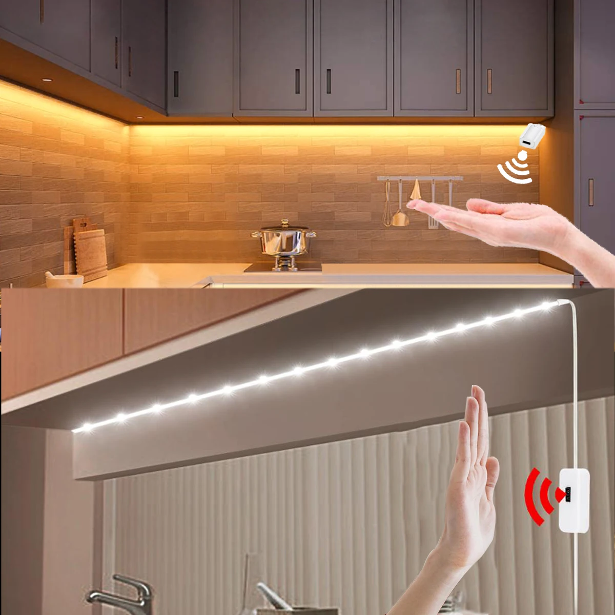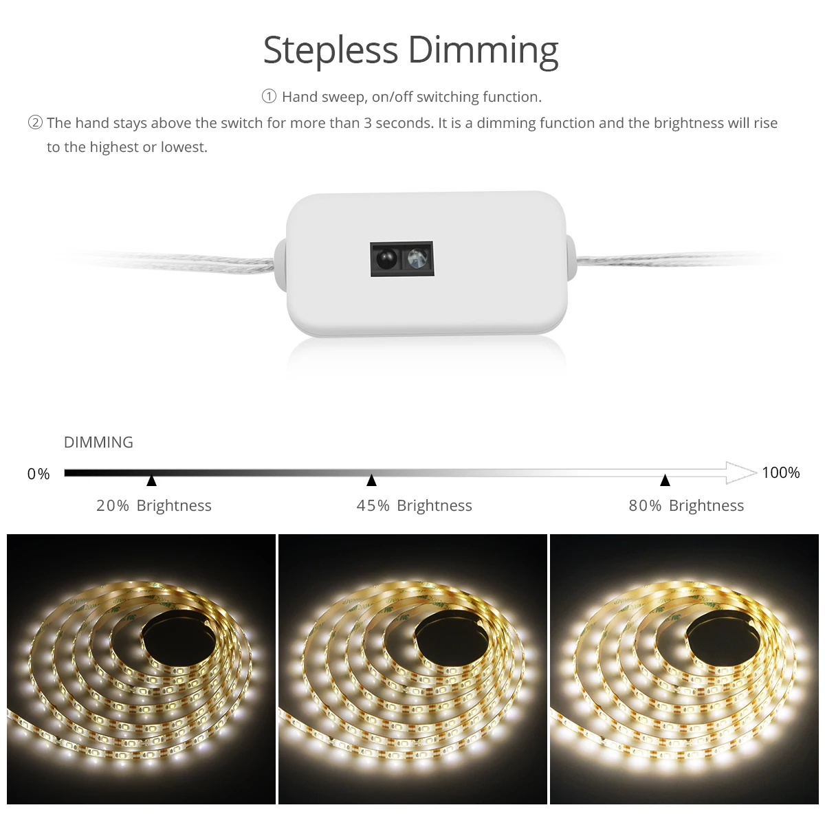 Особенности:1. Этот светильник с сенсорным переключателем ручной волны-идеальное решение для кухни, туалета в тех местах, где вы не хотите касаться выключателя, когда ваши руки мокрые, просто помахните рукой на выключатель, чтобы активировать светильник (рабочее расстояние составляет 2-5 см), снова Поверните, чтобы выключить.2. Идеально подходит для спальни кухни и шкафа, гардероба, шкафа, лестницы3. Легкая и легкая установка: вы можете приклеить его куда угодно с помощью клейкой ленты или винтов. Спецификация:Тип переключателя: ручной переключатель датчика разверткиЦвет освещения: белый/теплый белыйЦветовая температура: теплый белый (2800K-3000K)/белый (6000K-6500K)Тип светодиодов: 2835SMDДлина: 1 м/2 м/3 м/4 м/5 мНапряжение: DC5/12 ВАдаптер питания: питание от USB/DC адаптерРасстояние обнаружения: 2-5 смCRI:>85